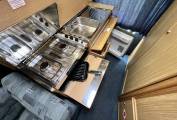 The kitchen runs along the rear of the driver’s side consisting of a Twin Gas Burner Hob, a Grill, a Three Energy Source Dometic Fridge, a Sink with Hot & Cold Water Supply, Mains and 12 Volt Electric Sockets plus plenty of cupboard space.