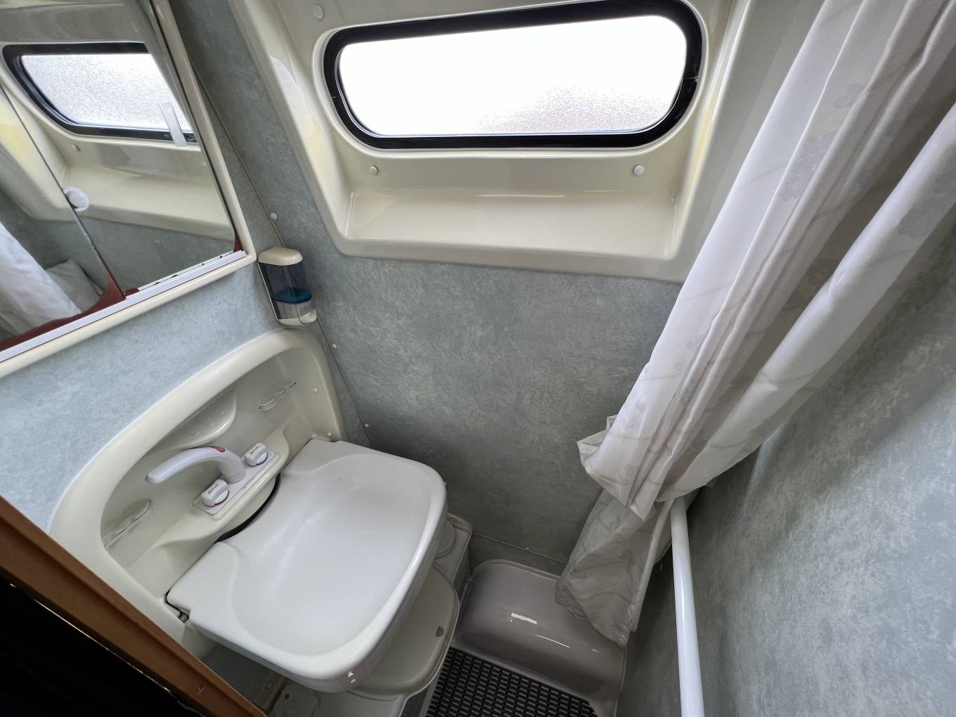 Opposite the kitchen is a corner wetroom style bathroom where you will find a Thetford Flush Cassette Toilet, a Foldaway Wash Handbasin and a Shower.