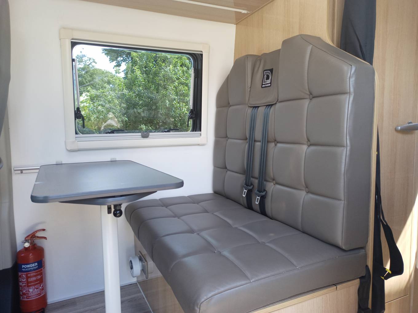 A feature exclusive to Dormobile is the occasional extra bed, which is comprised of poles (present) which provide a base for a further double above the rear lounge bed. Hence this a four belt, four berth offering.