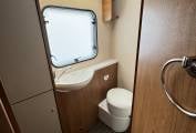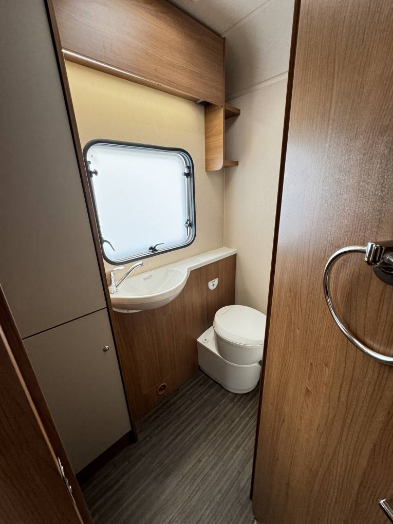 washbasin with a chrome mixer tap, a Thetford cassette swivel toilet with