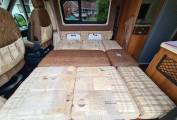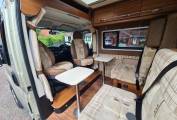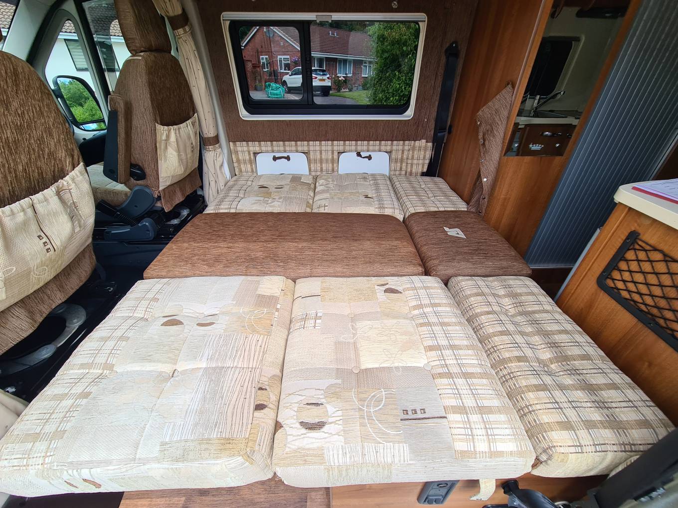 The dinette transforms into a large double with the single front facing seats accommodating 2 extra 3 point belts for the passengers.
