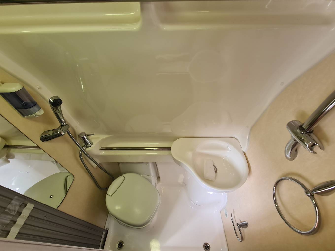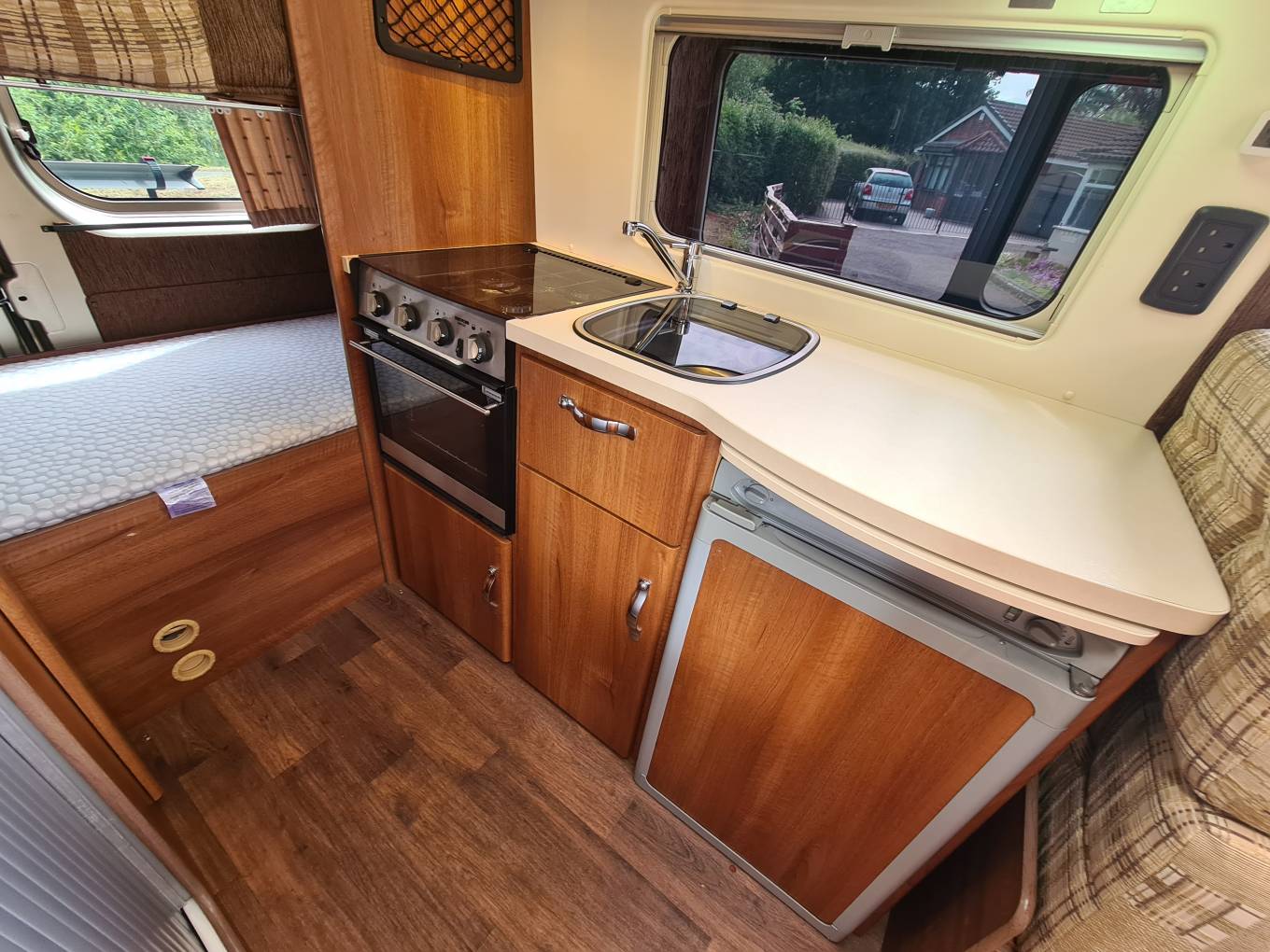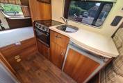 This is the popular rear bunk layout, with side washroom adjacent to an impressive kitchen equipped with 3 burner hob, oven/grill, microwave, extractor fan and 3-way fridge/freezer.