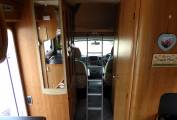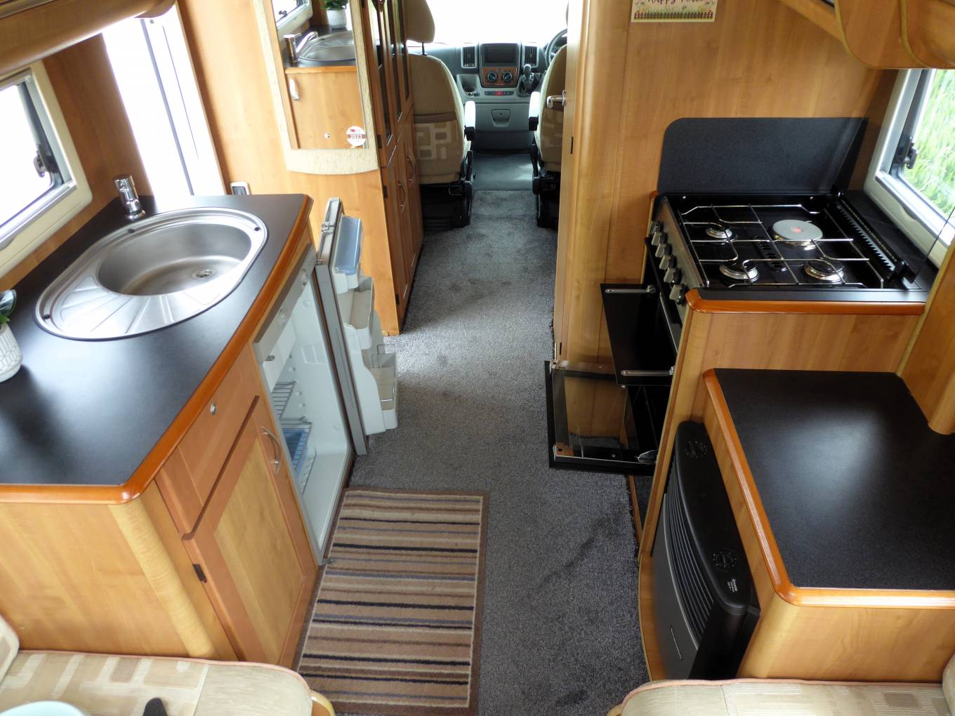 The basic layout is the rear lounge, kitchen covering both sides of the motorhome, good sized washroom, kitchen appliances on both sides of the motorhome and then overcab bed.