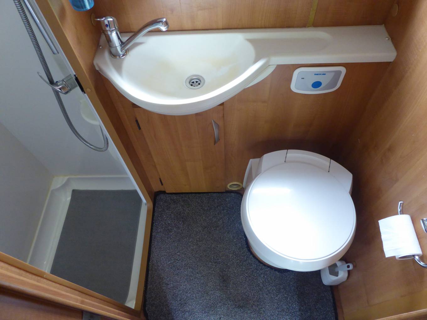 The bathroom includes sink, cassette toilet and shower with full enclosure.