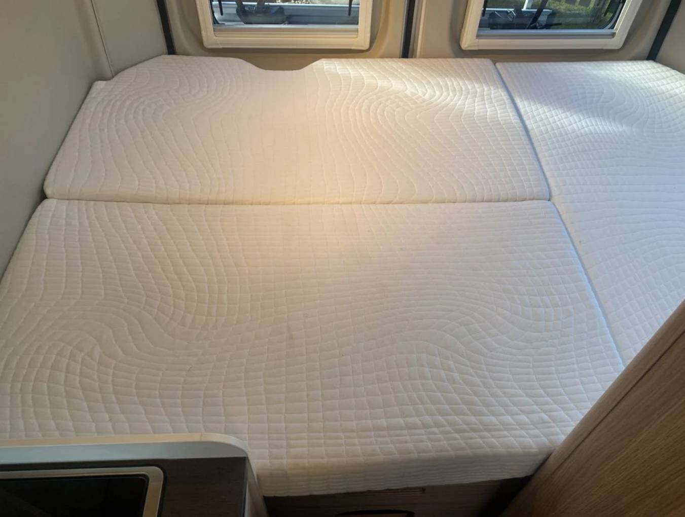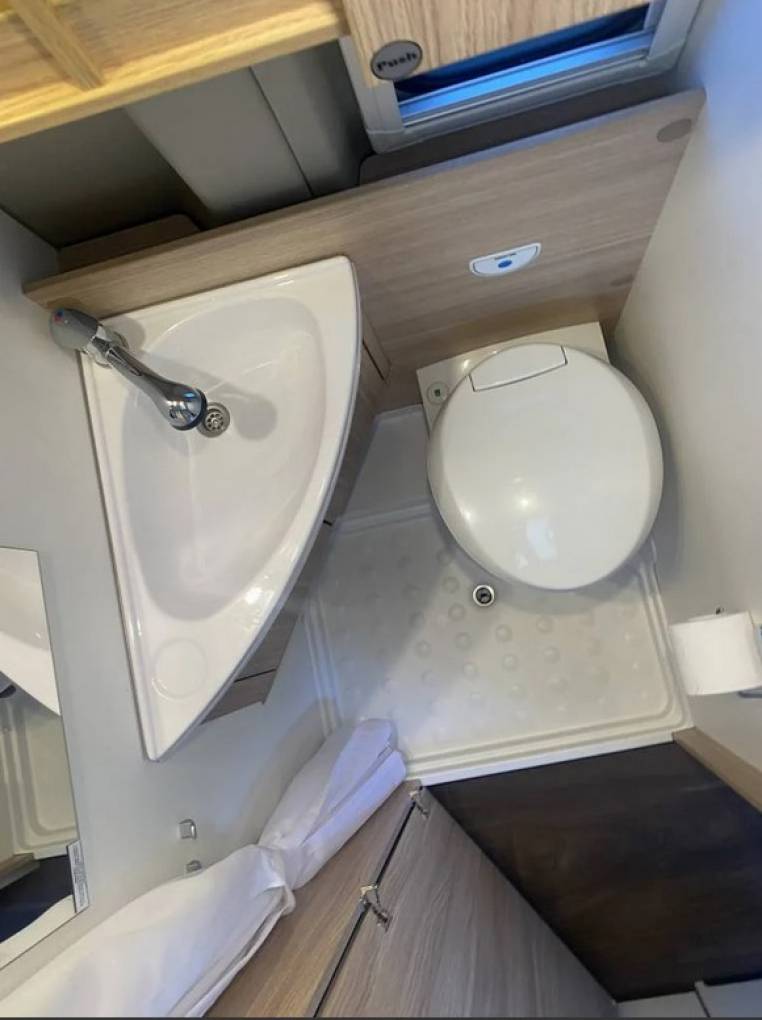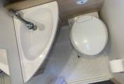 You then have a comfy dinette area at the front including driver and passenger swivel seats offering plenty of room for both eating and relaxing with the dining table extending or removed to your requirements. The mid kitchen includes a large fridge with freezer compartment, a 2 burner gas hob and good size sink with running hot and cold water. The bathroom is positioned opposite the kitchen and it has a full sized hot and cold shower, along with flush toilet, sink and mirror as well as additional cupboard space for toiletries. To fully maximise the space there are plenty of overhead lockers, plus additional space under the bed at the rear for all of your outdoor equipment and the camper comes with a child's over cabin bed.