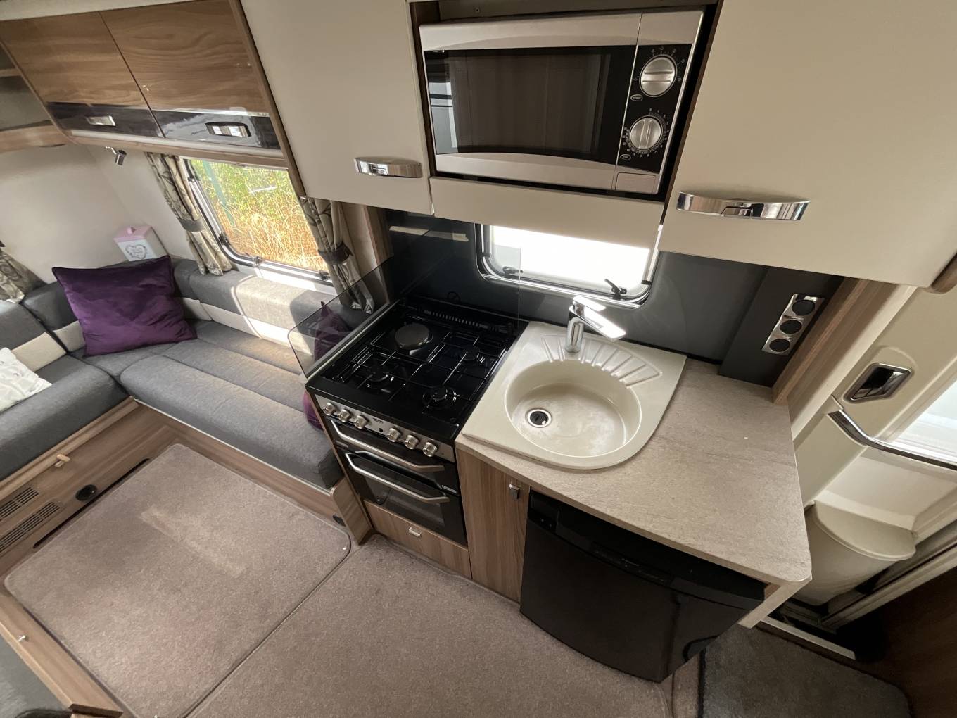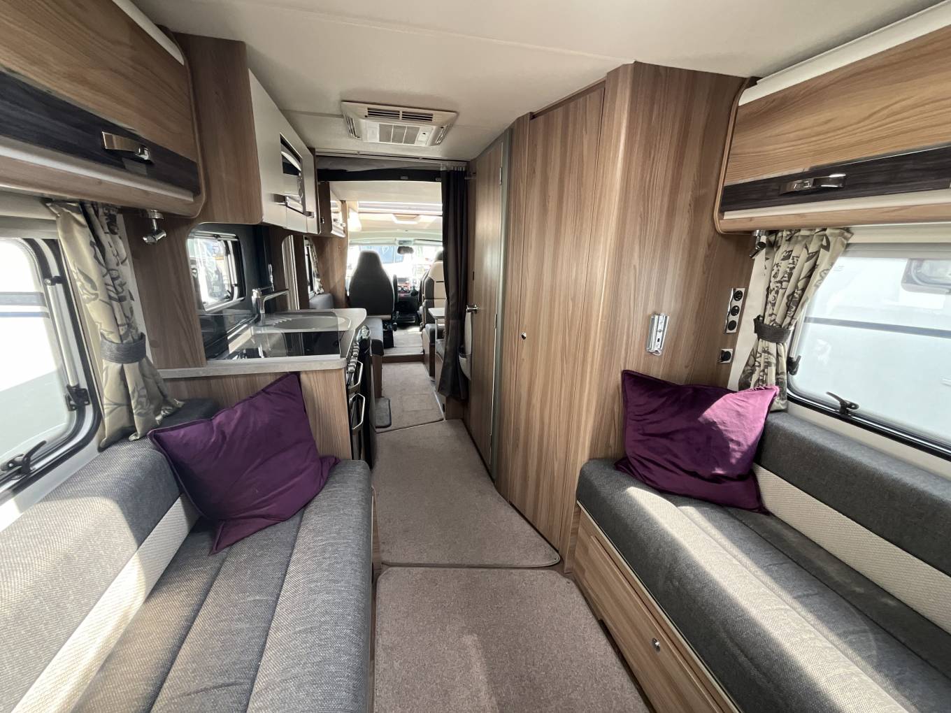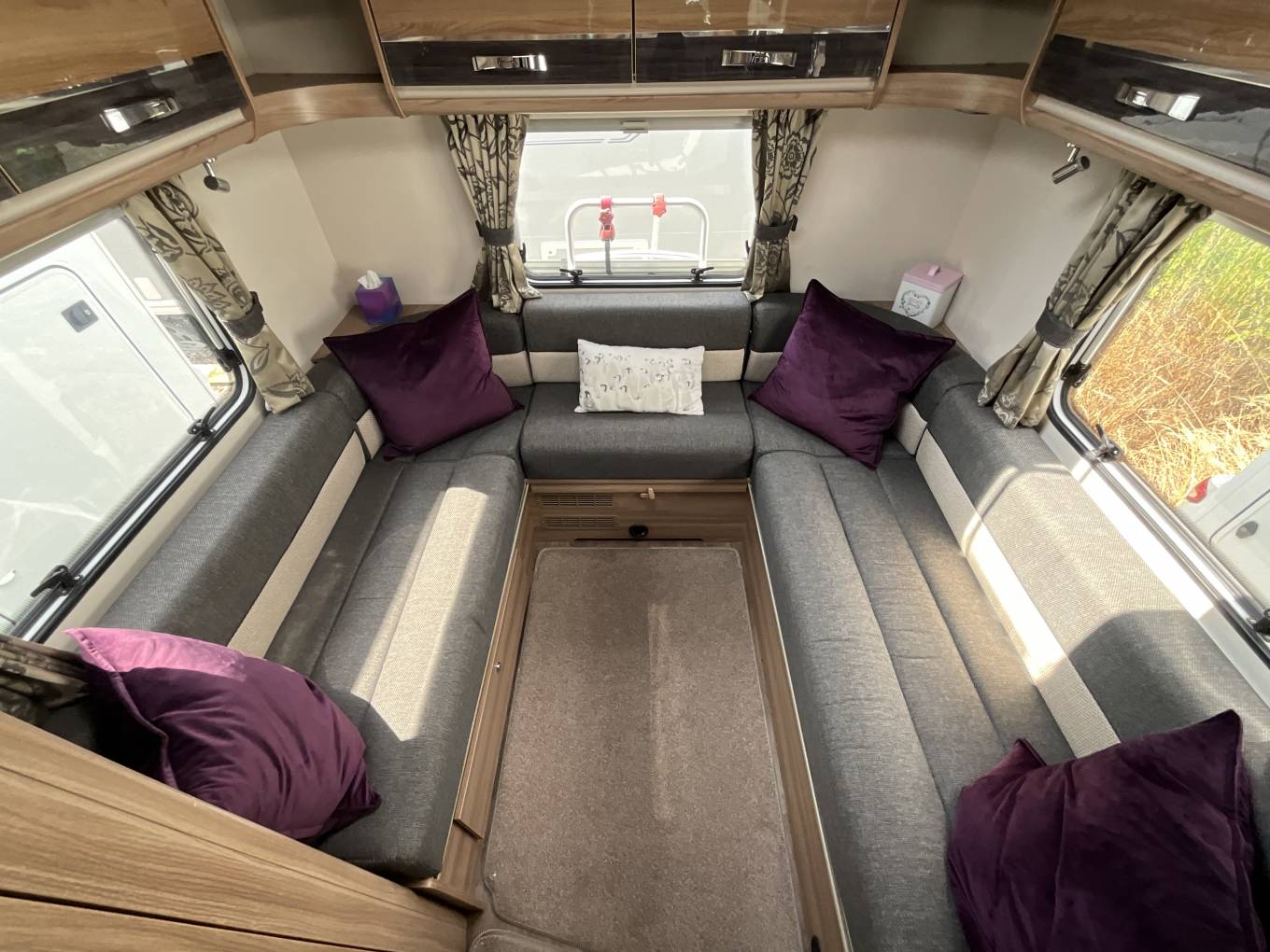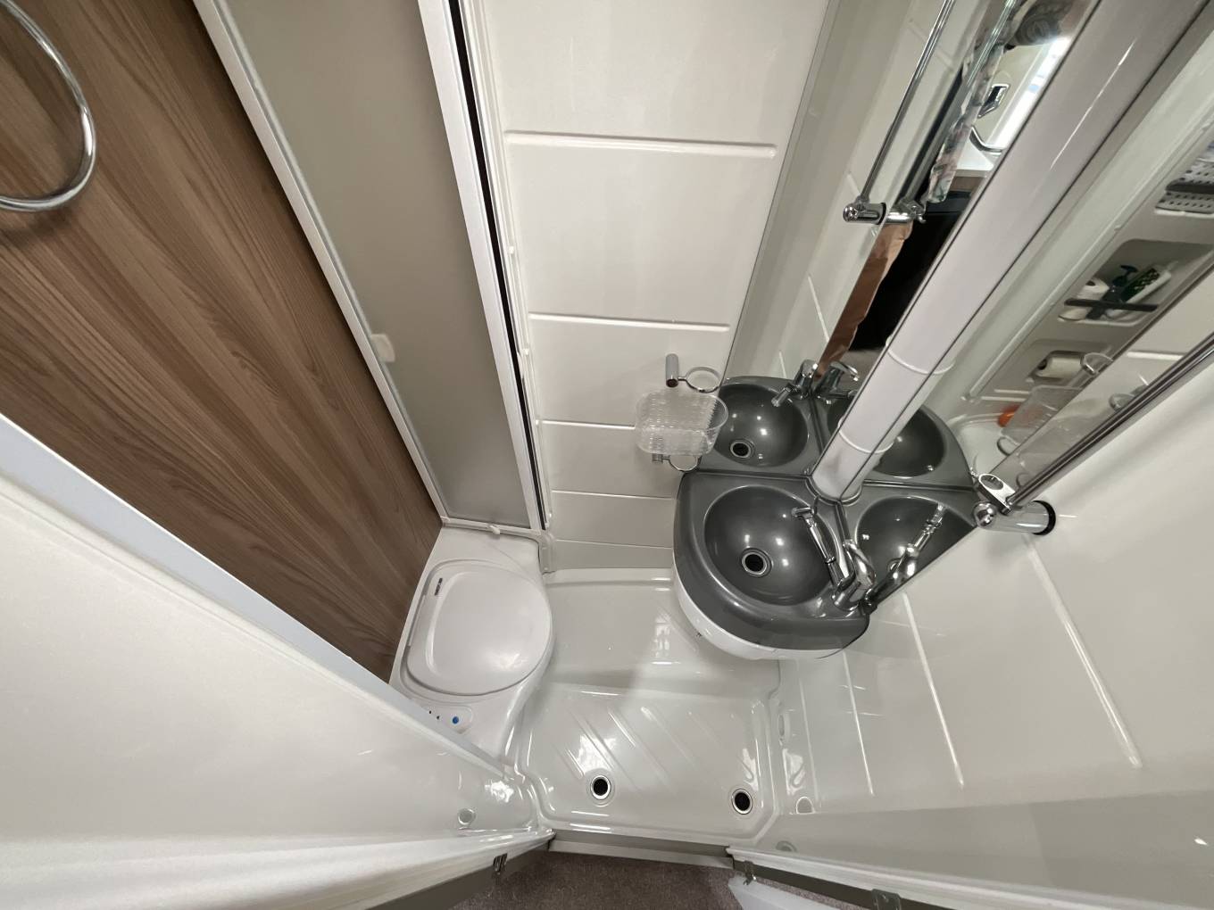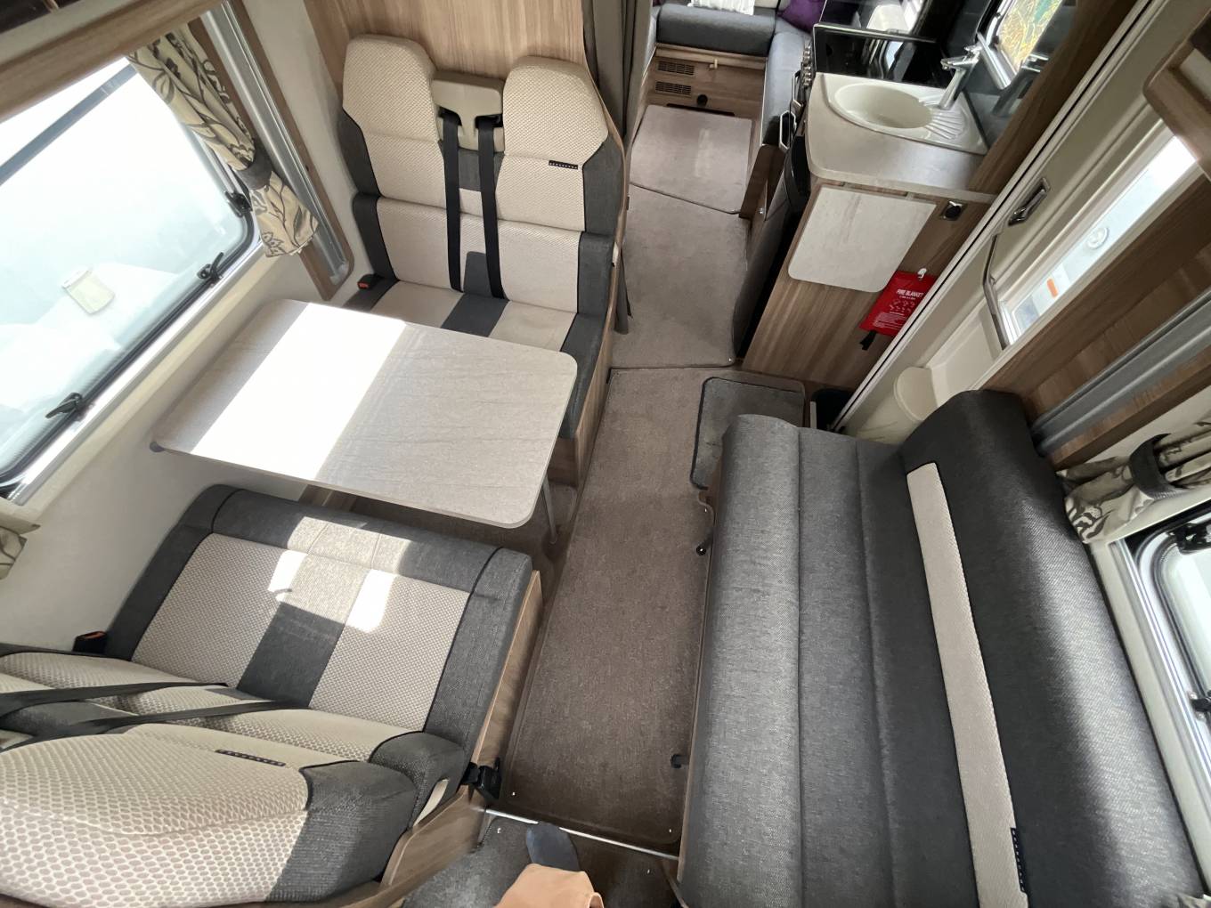 The stand out feature of this 496 is its rear U-shaped lounge with generous overhead storage which is flooded with natural light. As the night draws in this area easily converts into a large double bed. Moving forward in the motorhome you will find a practical washroom with a Thetford toile with electric flush, wash basin with mixer tap and shower. Adjacent to the washroom is the Bessacarr’s well equipped kitchen area complete with microwave, 3 ring gas hob & electric hotplate, oven & grill, fridge/freezer and a sink with mixer tap. To the front of the motorhome you’ll find a spacious dinette area which comfortably seats 6 people and includes an additional 4 seatbelts. This area also conveniently converts to a second double bed or two singles. Above the dinette area the final 2 berths are accommodated for with an electric drop down bed.