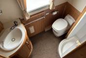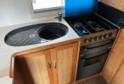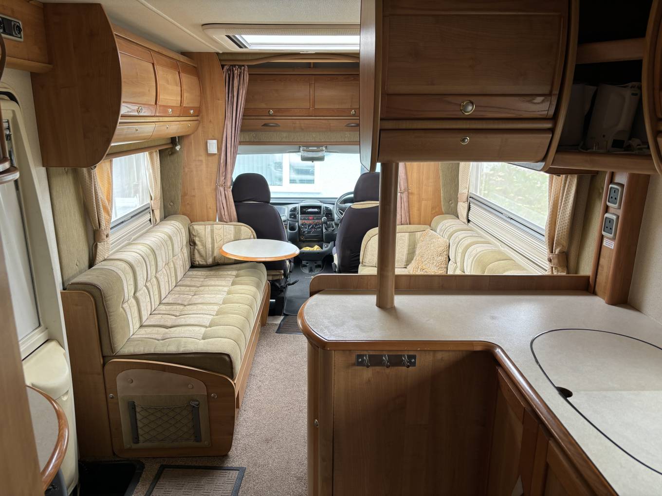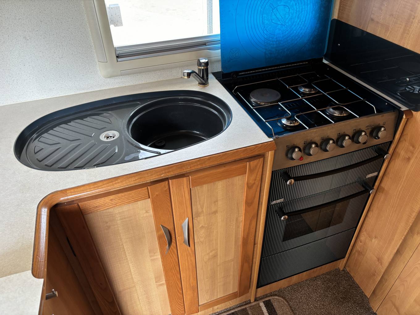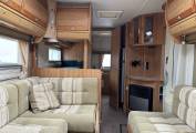 The living area is well laid out for plenty of space with a large end washroom with separate shower cubicle and a decent sized wardrobe. Further forward is the equally spacious kitchen area which is well kitted out with sink, 4 hobs, oven, grill, large fridge freezer and microwave. There are lots of cupboards and overhead lockers all around for plenty of storage too.