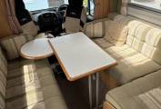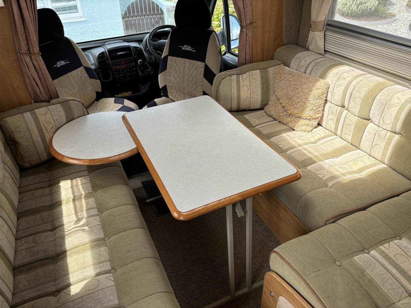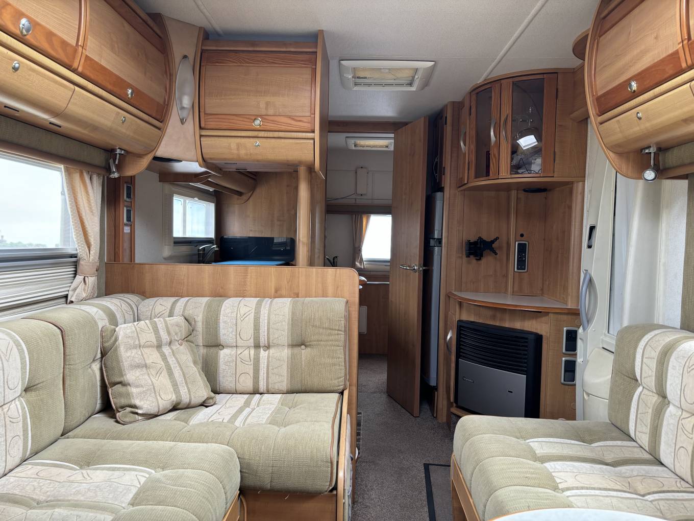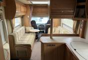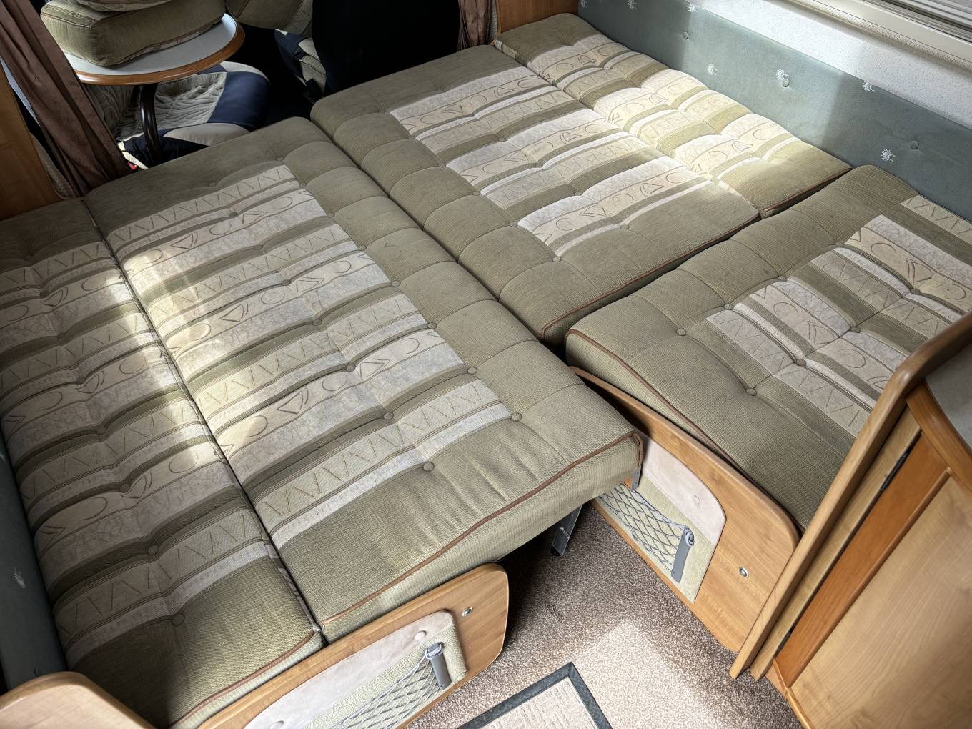 To the front is a nice lounge area which seats plenty of people especially with the 2 swivel seats included, and a fold away table for meal times. This converts into a large double bed or a smaller double next to a single to sleep 3 if necessary.