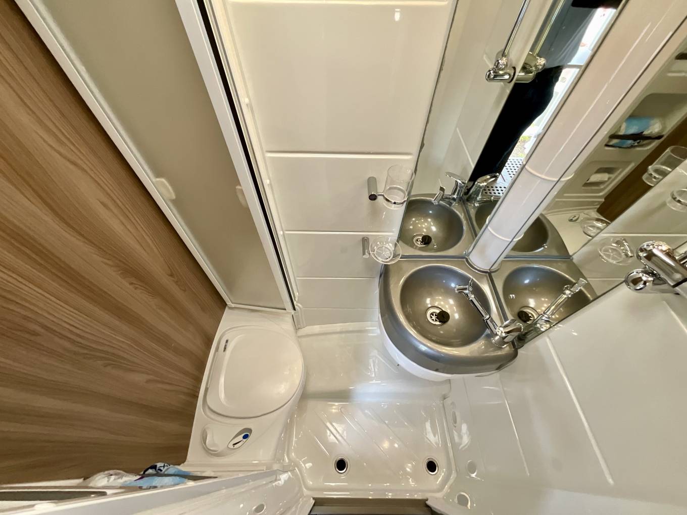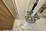 The sizeable washroom comes with shower, Thetford toilet with cassette, washbasin and vanity unit.