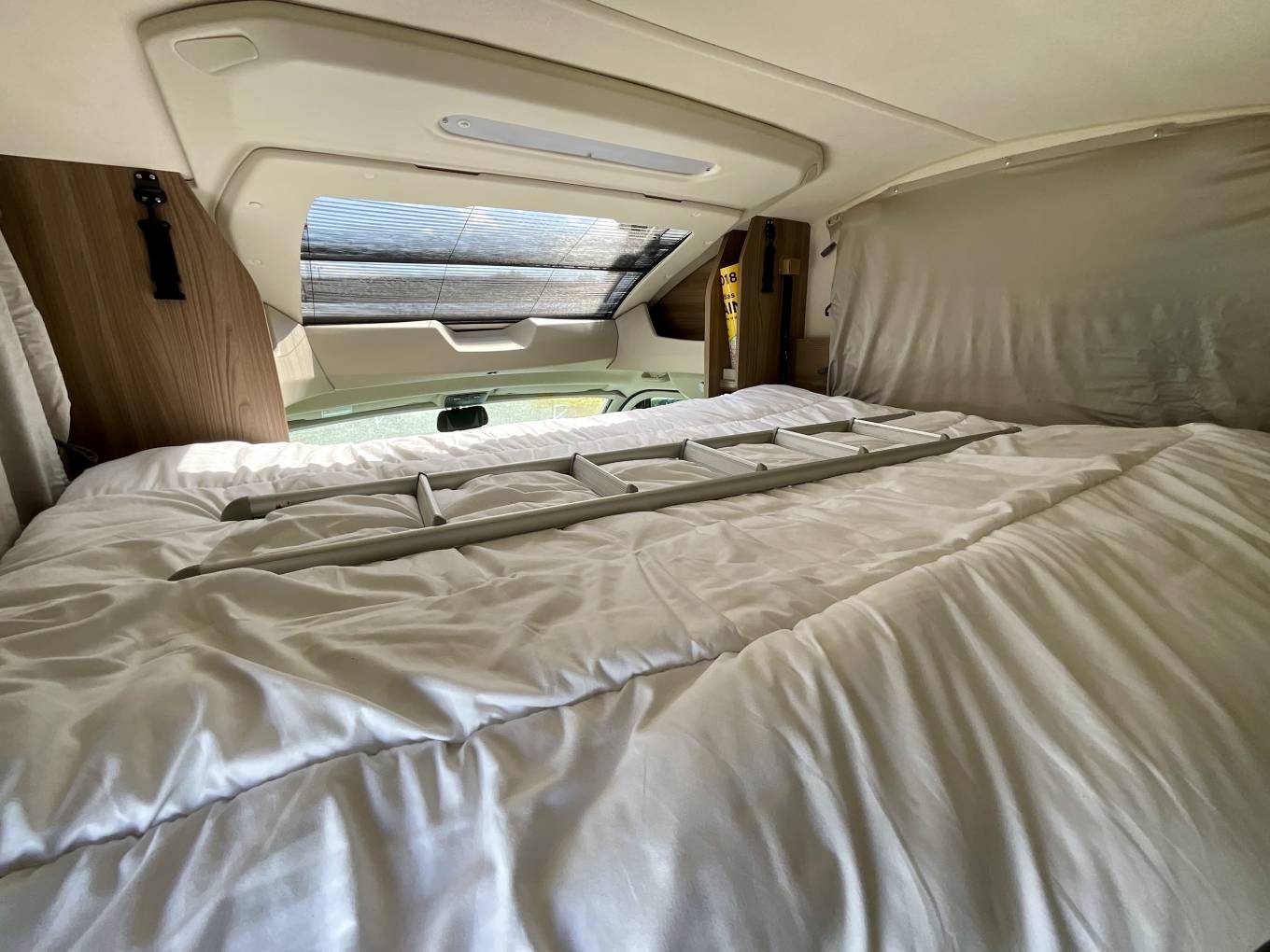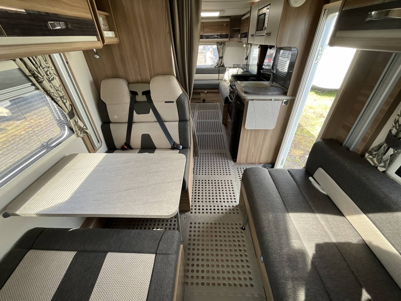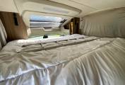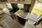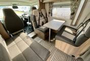 At the front, the double dinette lounge features a clip-in table, perfect for meal times and socialising. The habitation area is heated by a Truma dual fuel system, allowing the use of gas and electric to warm the interior. At night, the large electronic drop down bed can be lowered.