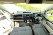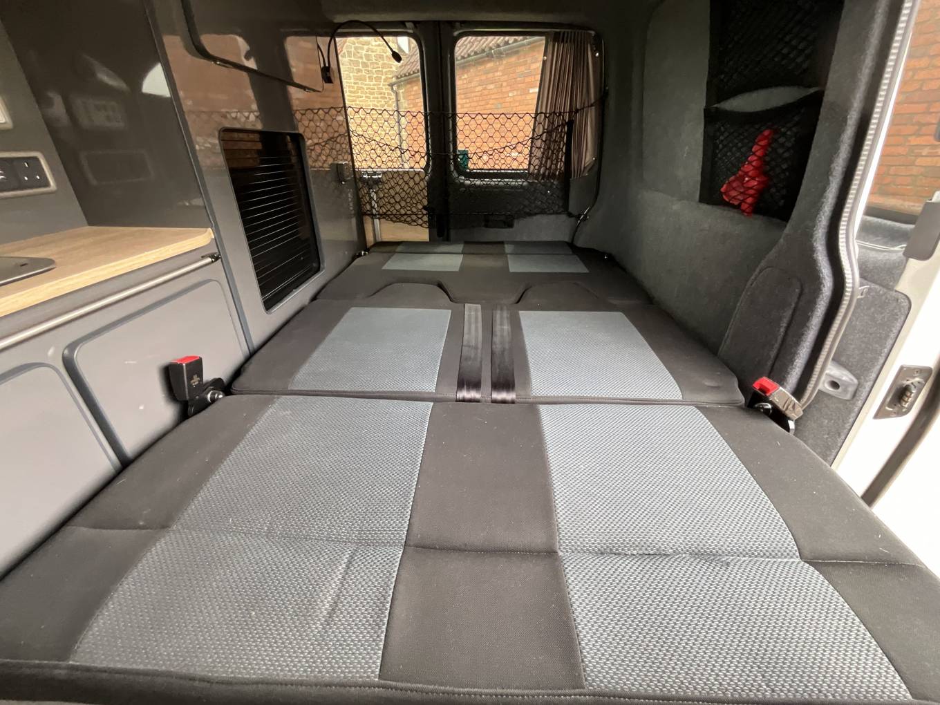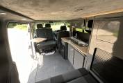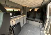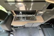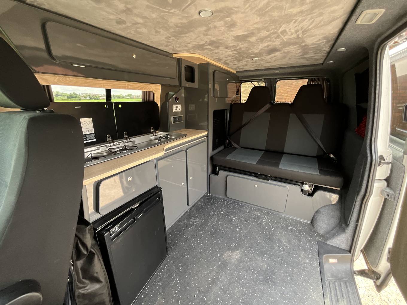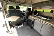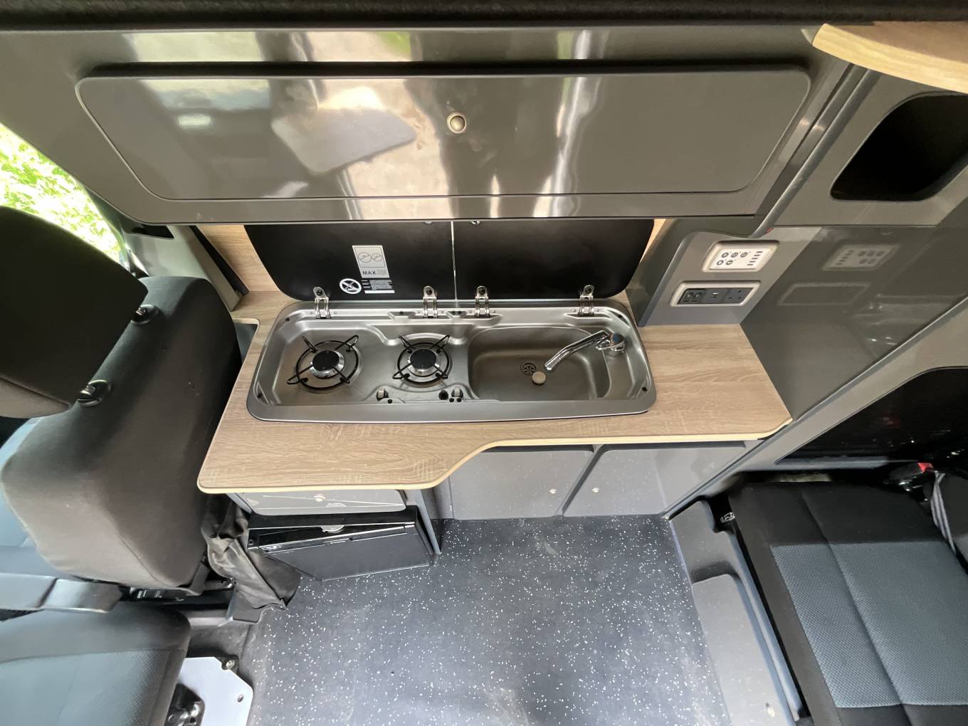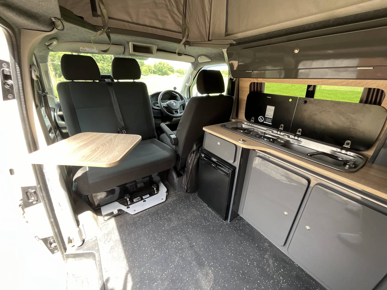Entering through the side door we are greeted by light grey high gloss units with a natural wooden top which keeps the interior light and airy. There is an abundance of storage along with a Dometic combination sink and hob, Dometic Fridge and the control panel for the heating and lighting etc. The rock and roll bed features two additional 3 point seatbelts and also creates a comfortable small double bed. For Dining the front double passenger seat can swivel to allow four to sit around the larger removable table. There is a second sleeping area in the pop top roof which features a memory foam mattress and a large front window in the pop top canvas along with two side openings with fly screens.