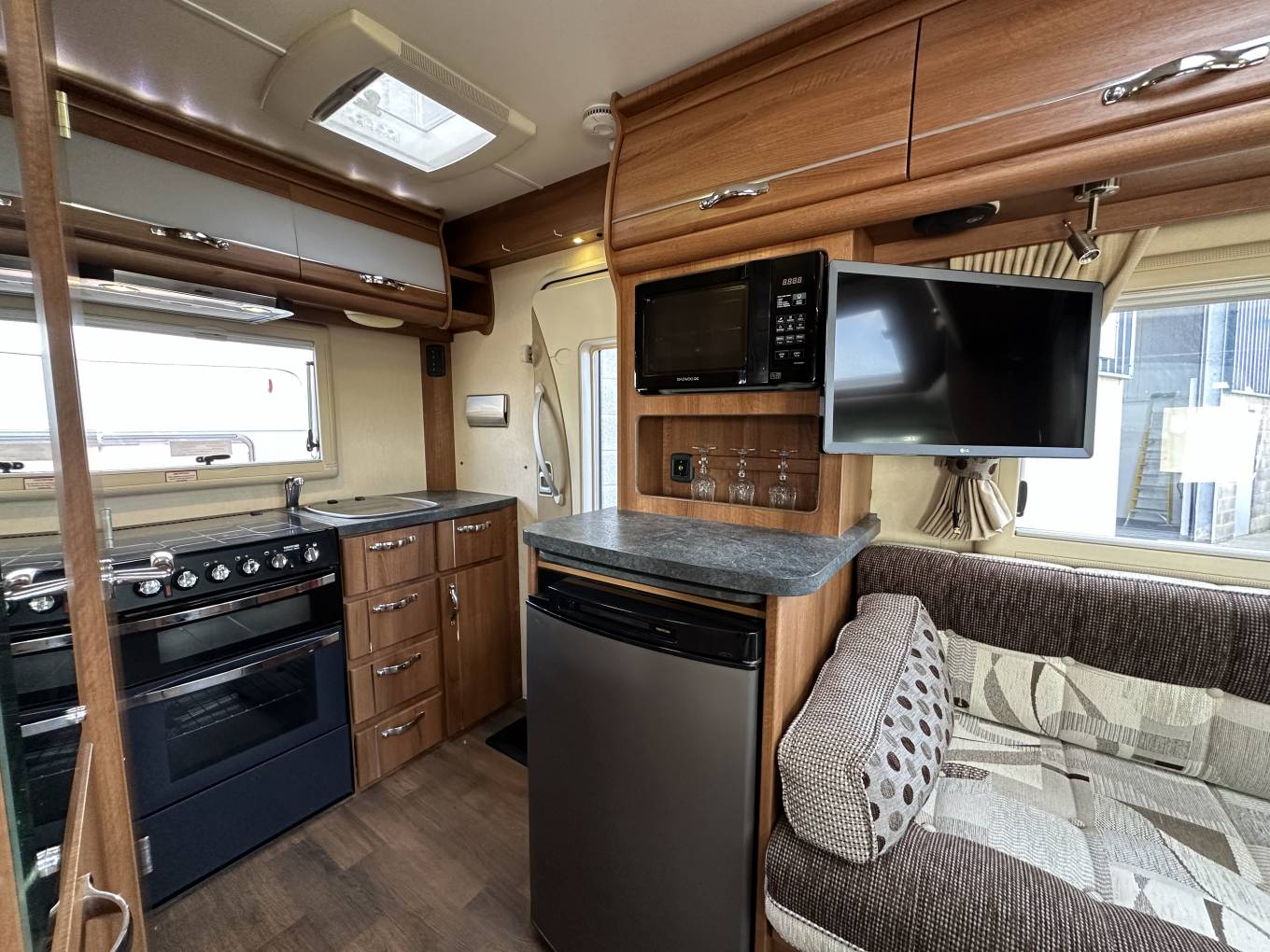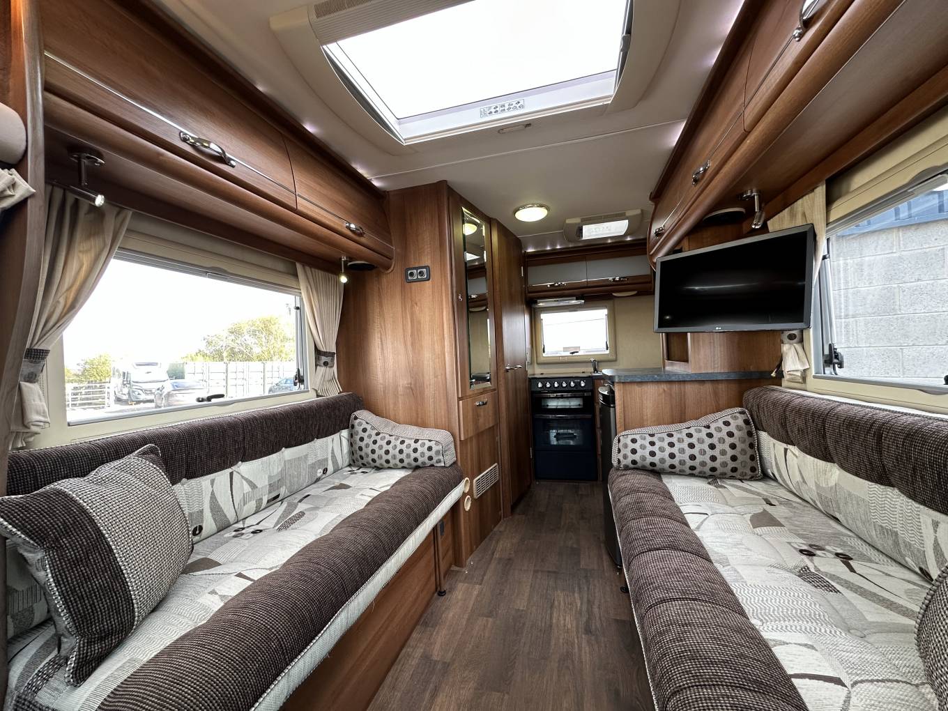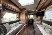 Living - Heating and hot water are provided by an Truma system on gas or electric - Double floored and winterised – Hab Trauma Air conditioning - TV points throughout - TV Aerial - Electric hook up - 230v and 12v power points - LED spotlights – Touch sensitive lighting - Dining table - Awning canopy - Lots of internal and external storage - Window blinds and flyscreens throughout - loose fit carpets.