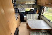 The lounge dinette features forward and rear facing 2 seater sofas both of which have a seat belt so 4 people can travel safely onboard this Hymer Swing. The dining tables fixes on to a side rail and this can be removed if you want more space. When it's time to sleep the dinette converts into a double bed.