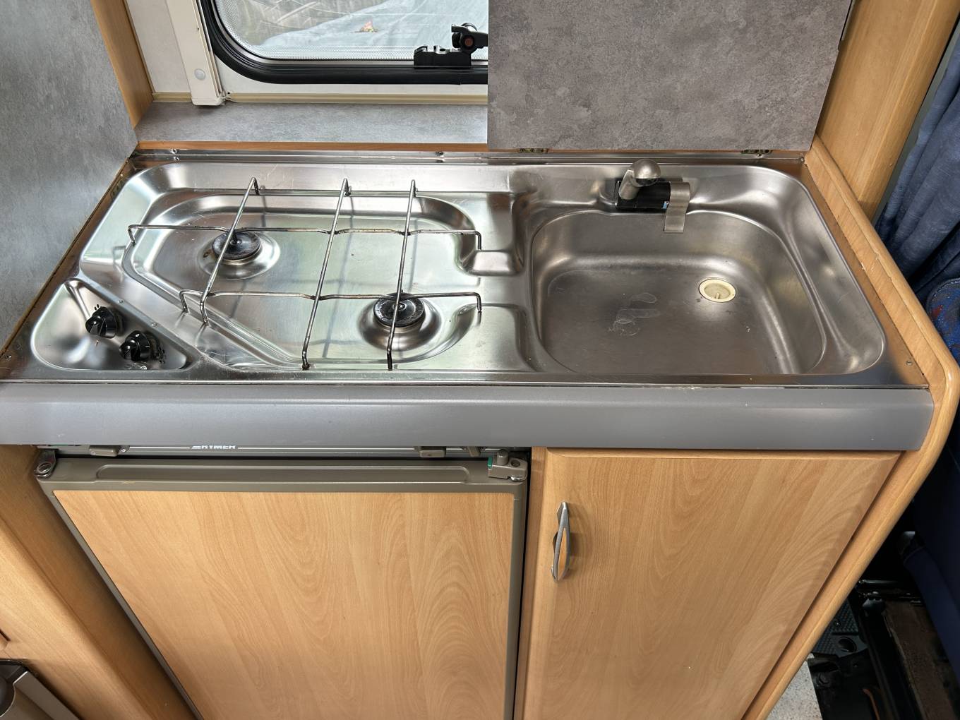 The mid-kitchen is equipped with a 3 gas burner hob and a microwave so you have plenty of cooking options. The fridge works off electric, gas and the leisure battery.