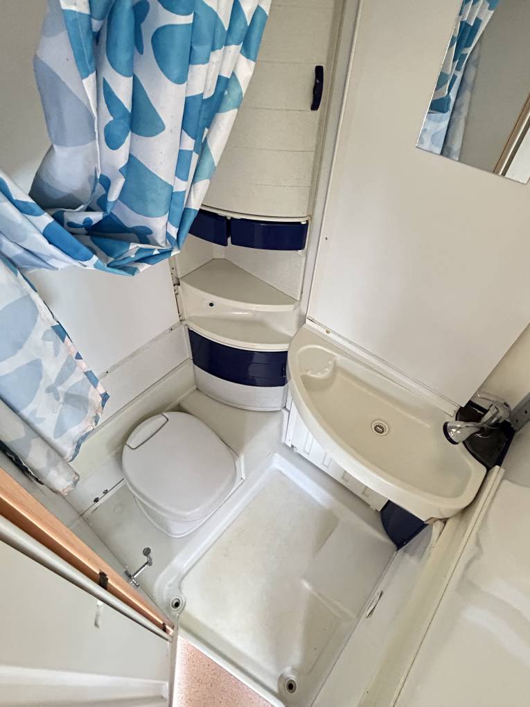 The layout inside the motorhome is very appealing. The washroom is towards the rear of the vehicle and here you have a Thetford cassette toilet, wash basin with a mixer tap, a bathroom cabinet to store your toiletries and a large mirror. There is a showerhead built into the wash basin so you can keep yourself fresh on your travels.