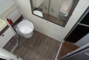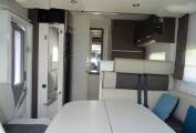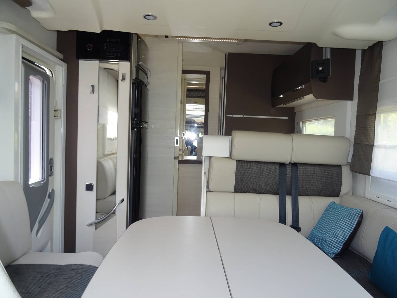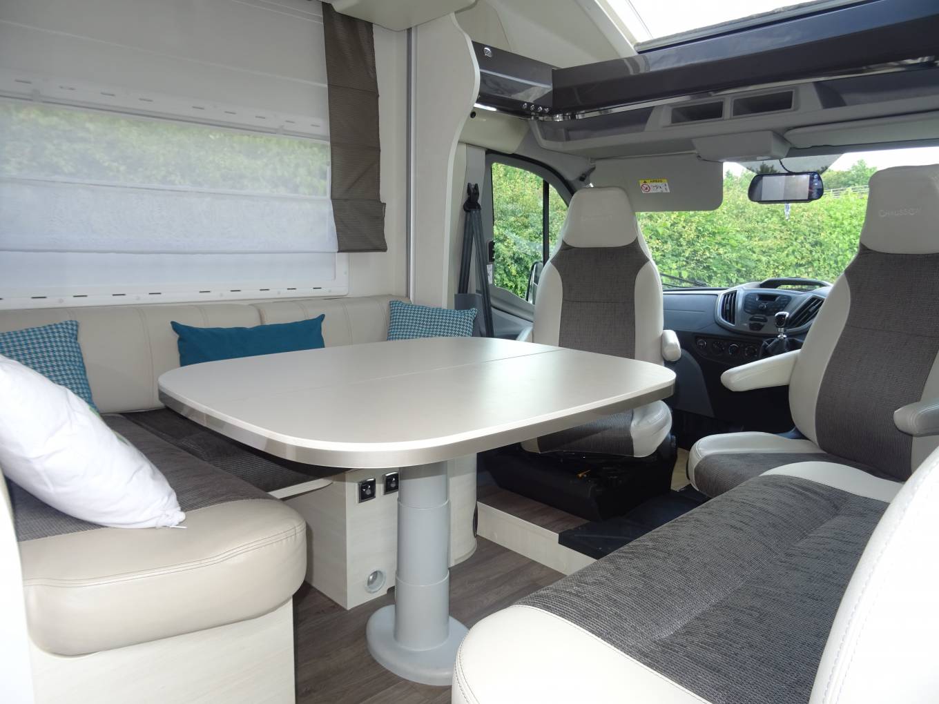 As you enter the side door immediately to the right is the dinette which has a 2 seater sofa next to the habitation door and opposite is an L shaped sofa. The front two seats swivel round to give you a large seating area for entertaining. The table can be lowered so you can make this into and additional bed. The main electric bed is situated above the dinette and can be easily lowered into position. This bed can be used in the higher position while using the bed below or will come down very low to the sofa height when not using the sofa bed.