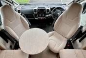 Irresitibly priced premium Frontier model from Autotrail, capable of extended trips away thanks to excellent facilities, extensive internal and external storage and healthy payload. The layout comprises of a forward dinette with twin side settees and swivel cab seats, central kitchen, washroom and wardrobe, with a transverse rear double bed over a low garage. The dinette can also convert into a three quarter double bed and this motorhome has two seatbelts in total.