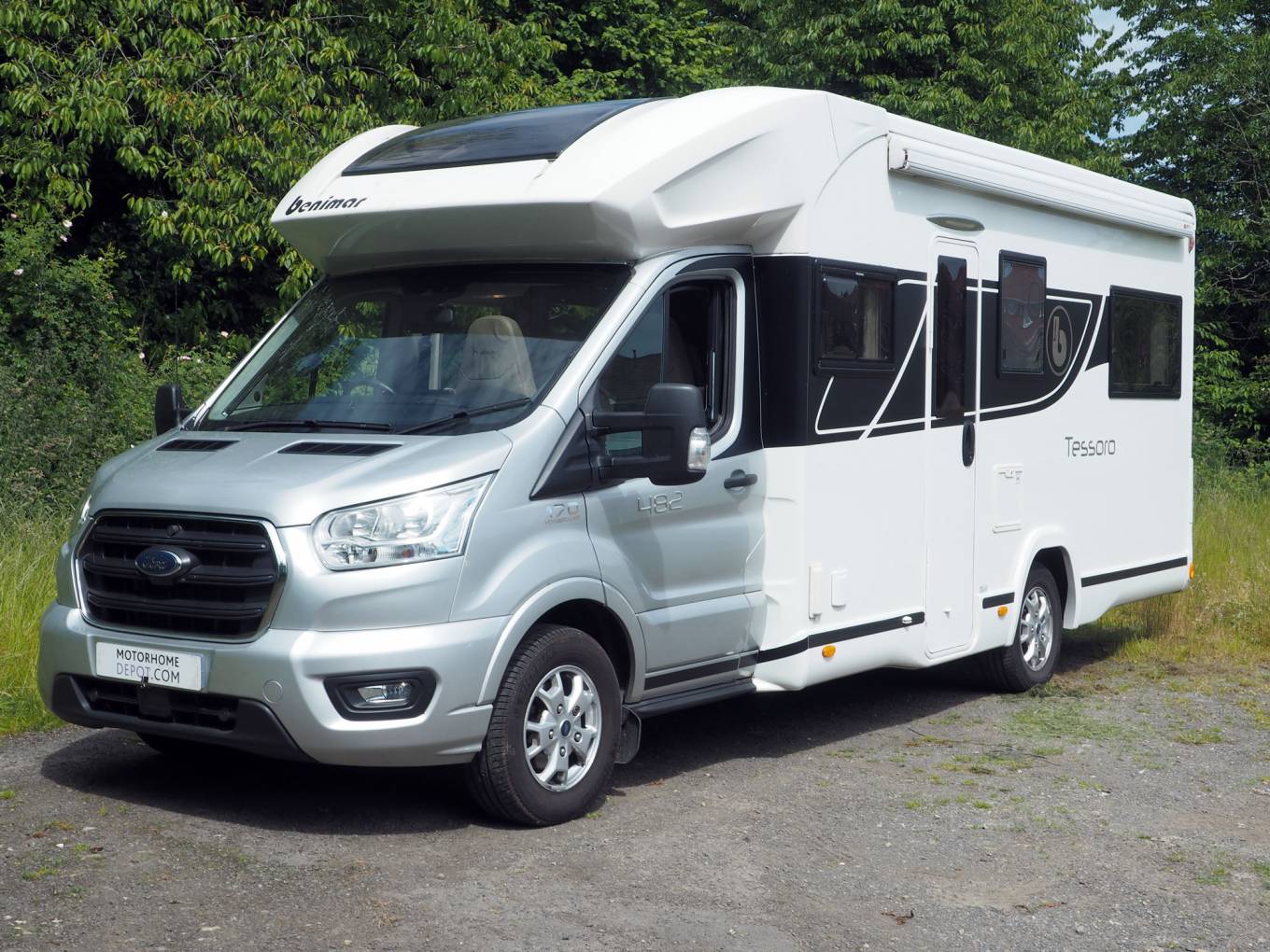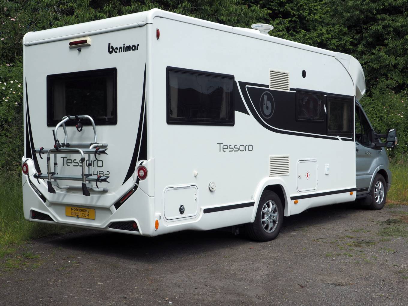 Fabulously appointed, rare and versatile automatic transmission Benimar Tessoro 482 low profile motorhome, in excellent condition with desirable Truma roof mounted habitation air conditioning upgrade. The Tessoro is the premier range from Benimar with very high specification including opening front sunroof, awning, external BBQ point, external shower, bike rack, solar panel. Based on the latest generation Ford Transit with automatic gearbox, the Tessoro is plated at 3500KGs and can be driven on a standard car licence.
