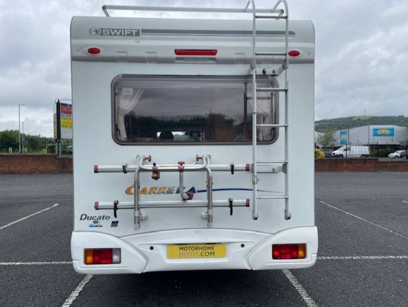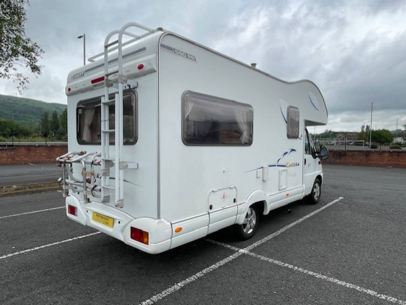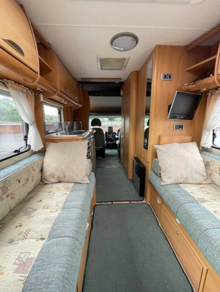 Heating and hot water provided by the Truma system Additional items fitted to the motorhome include a TV, bicycle rack and an awning.