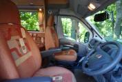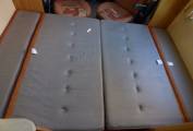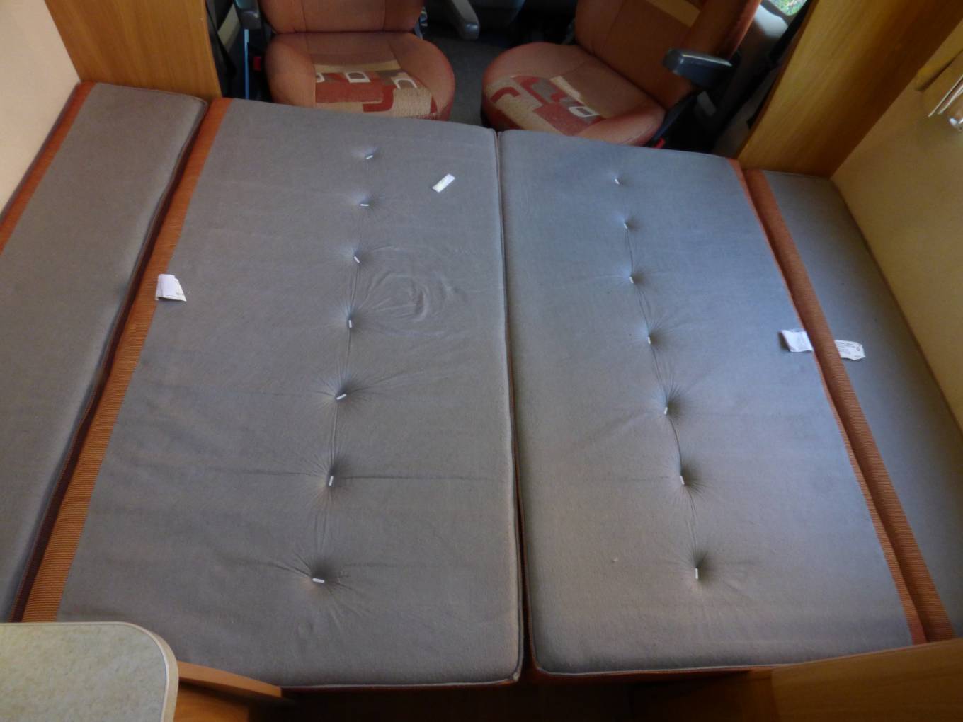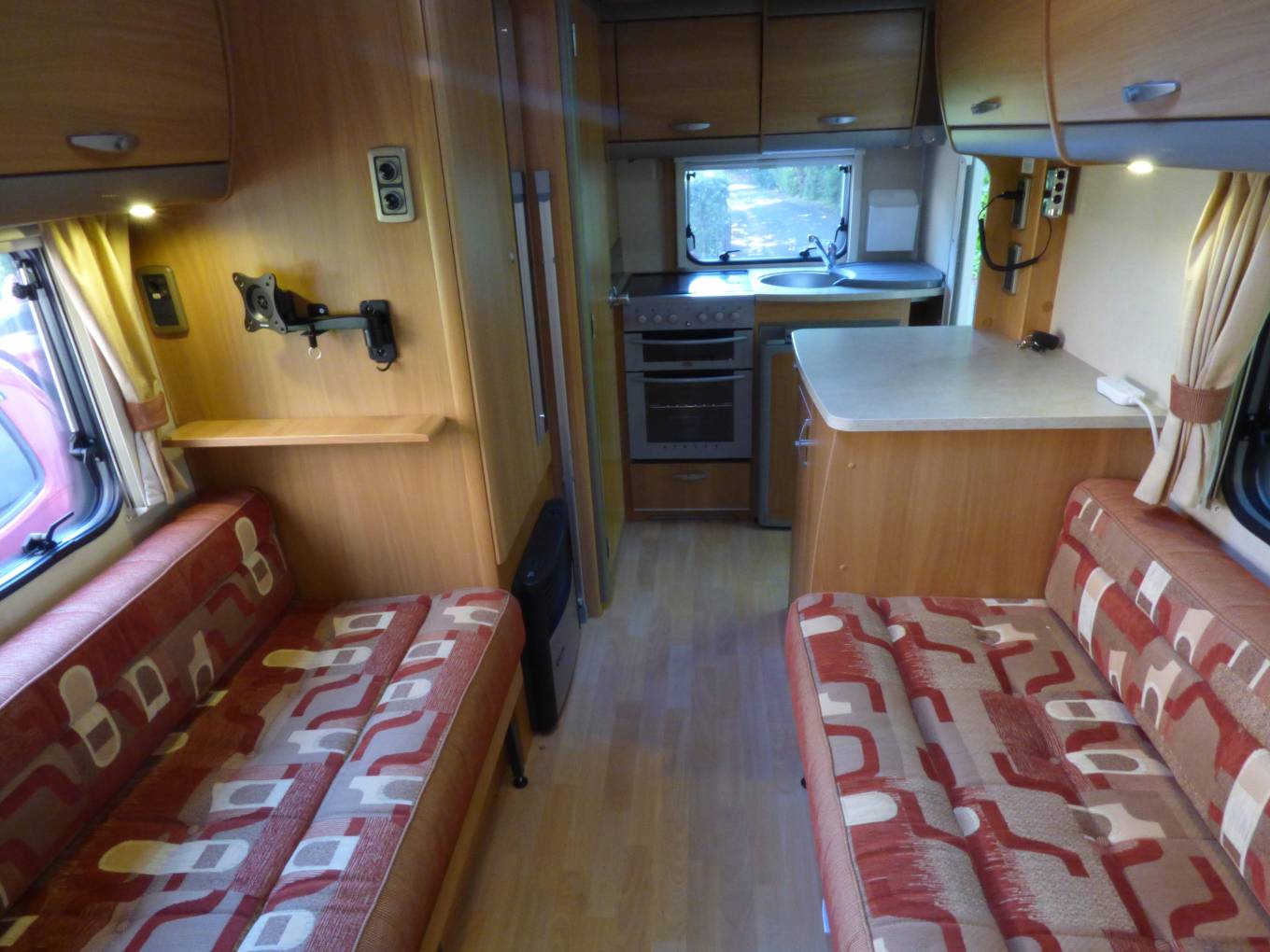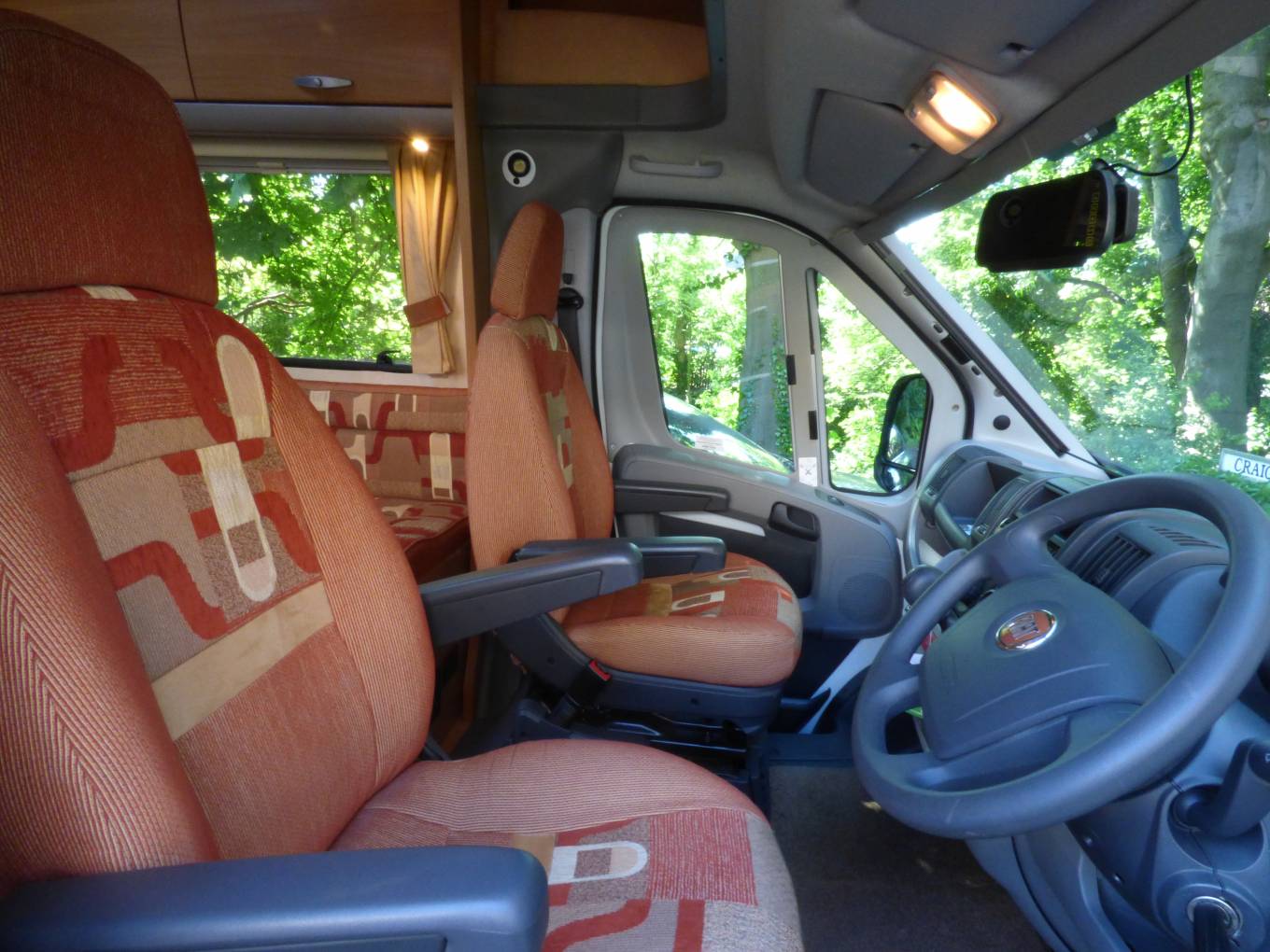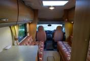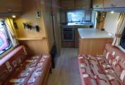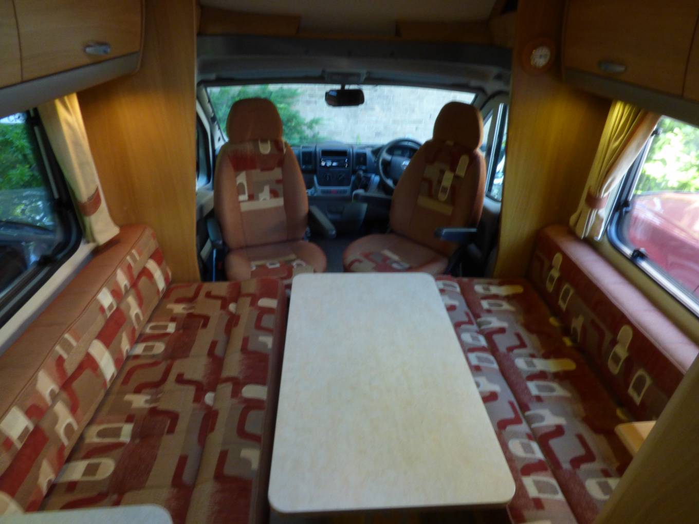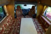 Next to the bathroom is a large wardrobe and opposite is a locker with large prep area and space for a TV. Moving forward into the lounge area we have two side benches, very well upholstered and these pull together very easily to form a large double bed. During the daytime of course, this is the saloon/dining area and with the large collapsible table (stored in the wardrobe) and the Captain's style front seats which swivel, there is easily enough room for 6 people.