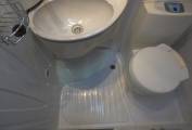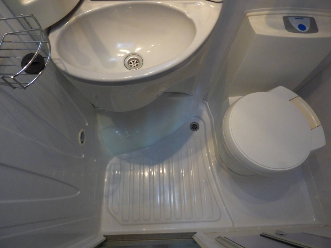 The layout comprises a rear nearside habitation door with electric step (and two way secure lock) opening into the kitchen at the rear of the vehicle. With separate grill and oven plus 3 ring gas hob with one electric ring, room for and wiring for a microwave, a fridge freezer and there is lots of locker/preparation space. Next to the kitchen area is the washroom with Thetford cassette toilet, washbasin and full head height shower with shared mixer tap. A vanity unit and mirror completes this very well maintained area.
