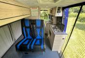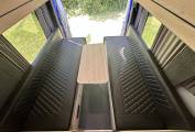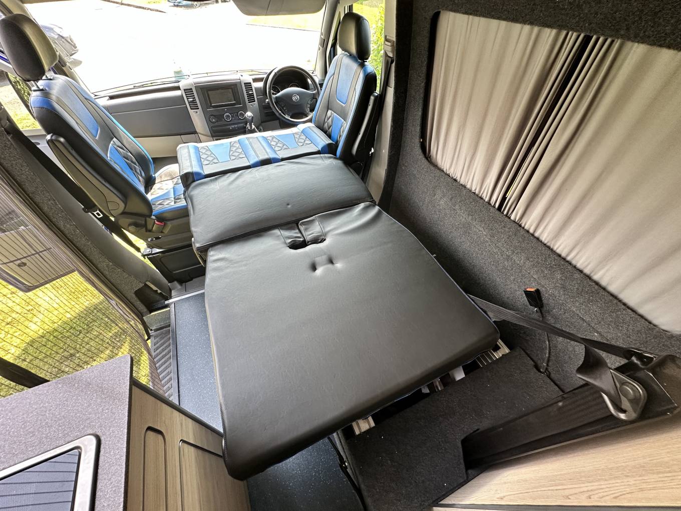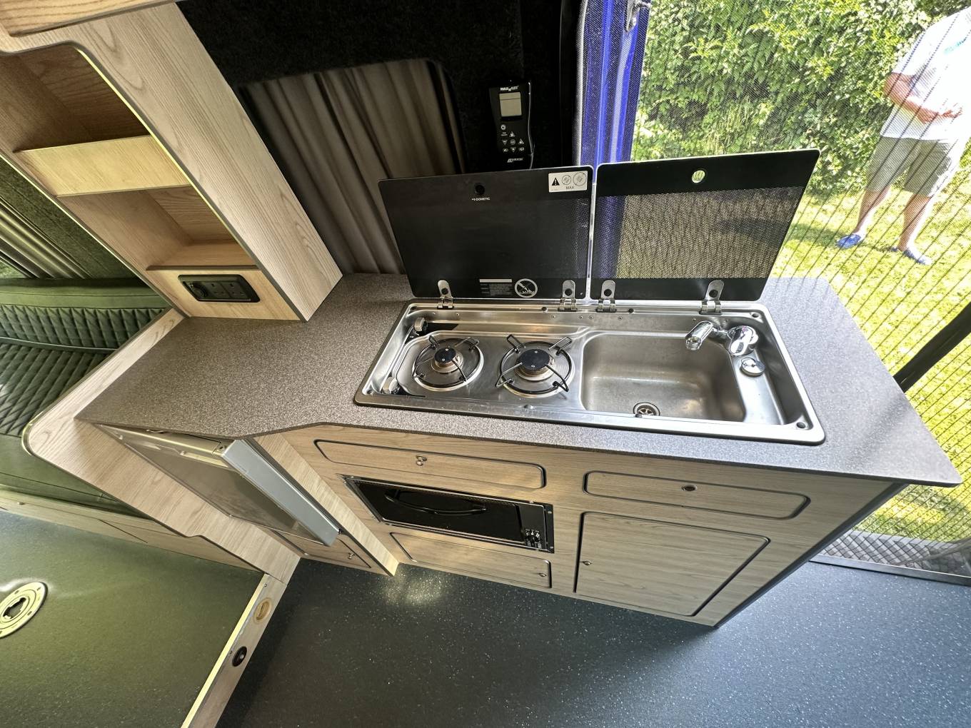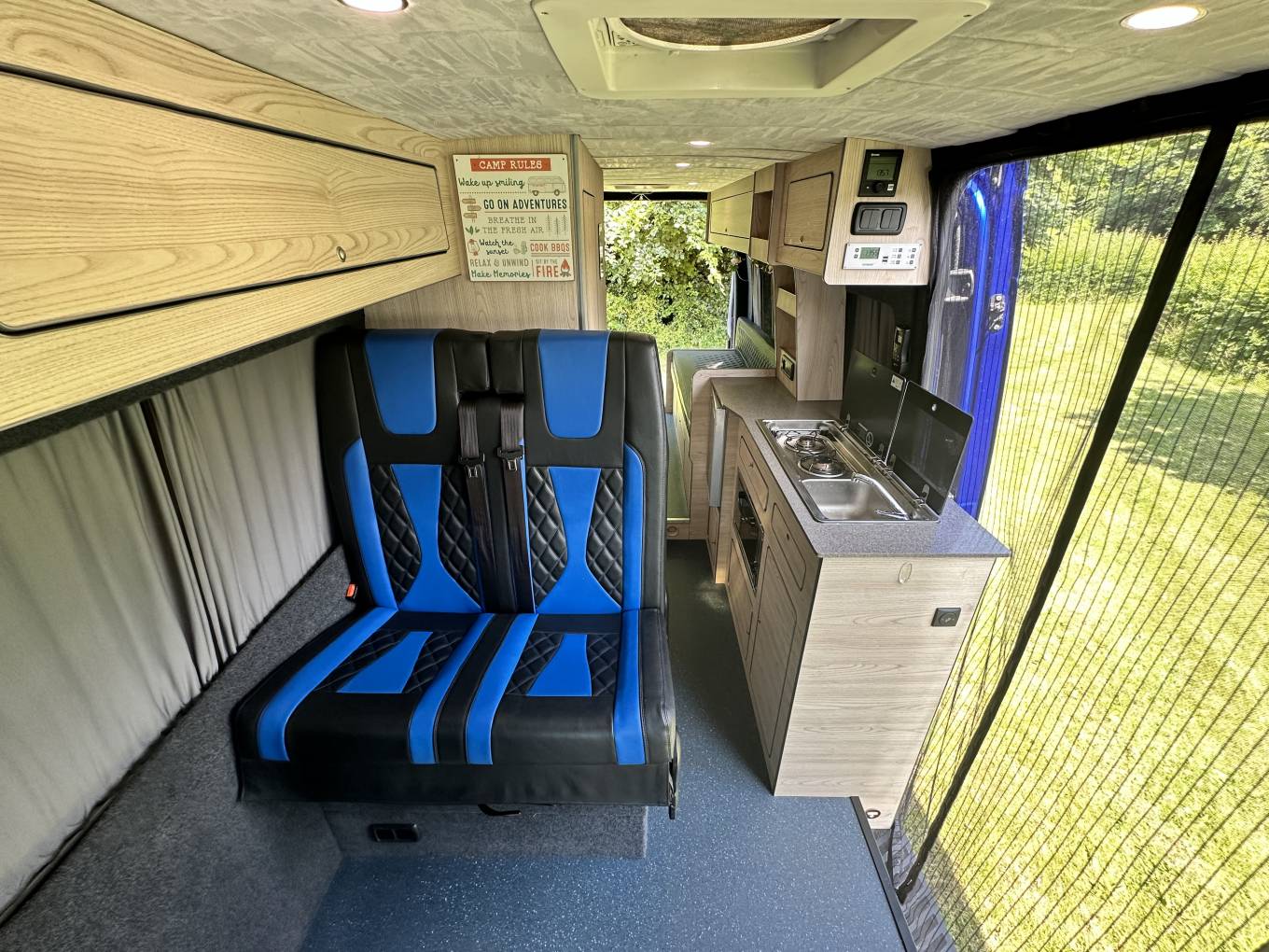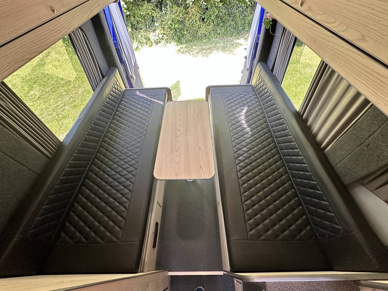 To the rear you will find the spacious dinette area which comfortably seats up to 6 people, perfect for relaxing or entertaining. As the sun is setting this area easily converts into a huge, super king sized bed. There is an abundance of storage above and underneath the bench seats. Moving forward is the well equipped kitchen including a Dometic sink, with mixer tap, 2 gas hob, oven and grill, fridge with separate freezer compartment and ample storage. Adjacent to this is the functional washroom which includes cassette toilet and shower. To the front you will find a double bench seat with 2 three point seat belts, enabling this camper to travel with up to 4 in full safety. This can also be used as a dinette area for 4 people, incorporating the front 2 captain rotation seats. This seating area effortlessly converts to a comfortable double bed, completing this 4 berth campervan.