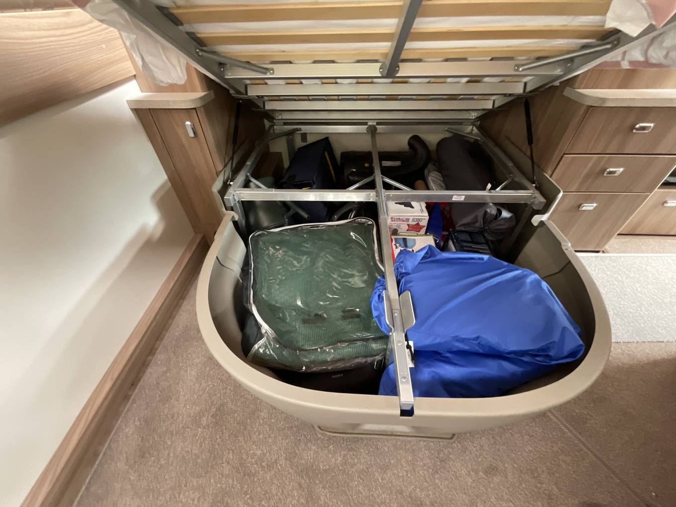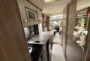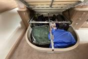 Step inside and the lounge and dining area is to your left, with a side sofa and two forward facing seats that have two 3-point seat belts. A dining table clips to the side rail in the evening it makes up the bottom of the additional double bed, during the day or whilst travelling it stores away in a wardrobe, there are aircraft style lockers and under-seat storage available.