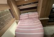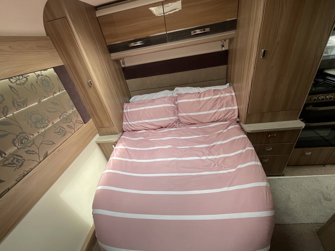 The main feature of the motorhome is the rear bedroom with a fixed transverse island bed, which means a couple can both access the bed without climbing over each other, the bed also extends to allow for taller adults. There's a wardrobe each side, storage drawers and there's a small dressing table with mirrors and additional storage cupboards.