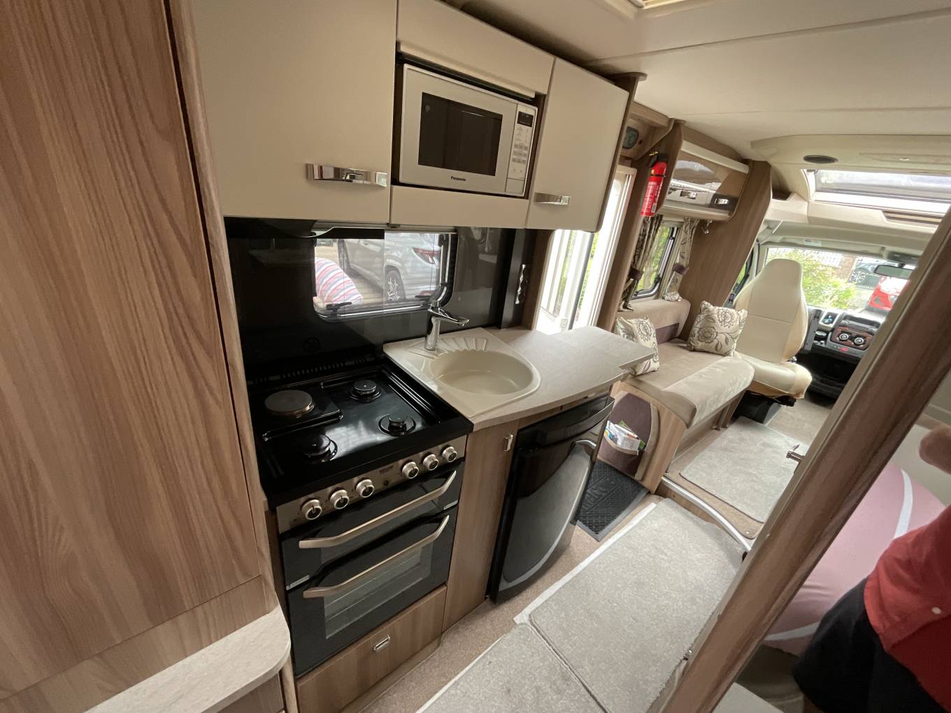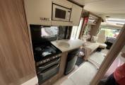 The kitchen is well specified with a large round designer style sink and chrome mixer tap, a dual fuel hob with 3 gas burners and an electric hotplate, gas grill and oven beneath, a Dometic 3-way powered fridge with removable freezer box, a built-in stainless steel microwave oven, a pop-up additional counter space plus plenty of cabinets and cupboards to store away your holiday provisions.