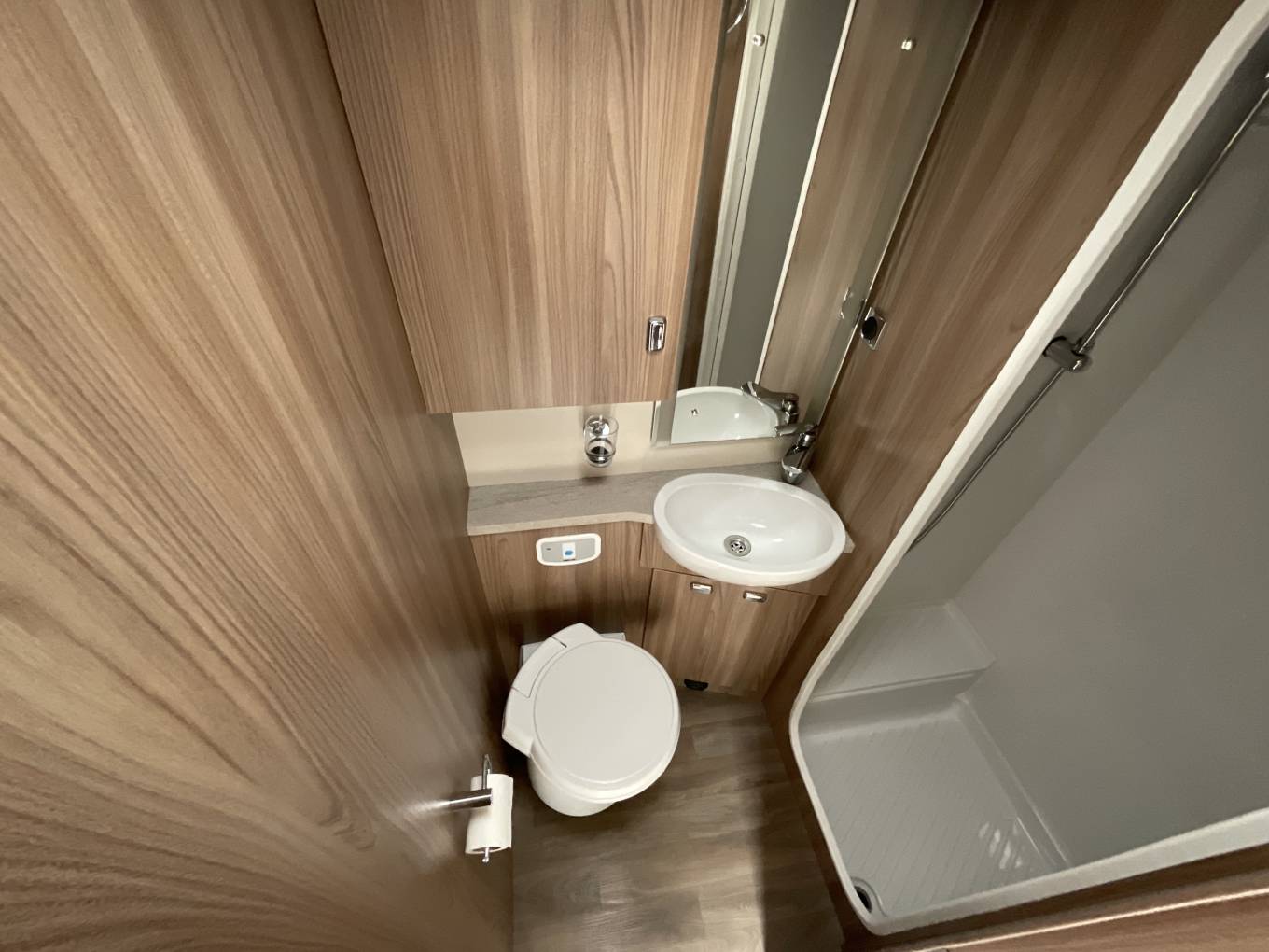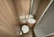 The washroom has a good sized separate shower cubicle with rising rail and shower handset, folding perspex shower doors, a built-in washbasin with chrome mixer tap, plus a Thetford cassette swivelling toilet with electric flush.