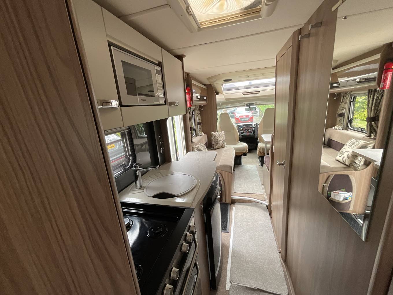 Truma gas and electric central heating and hot water heating, loose fit carpets, black-out blinds and fly-screens throughout including to the main door.