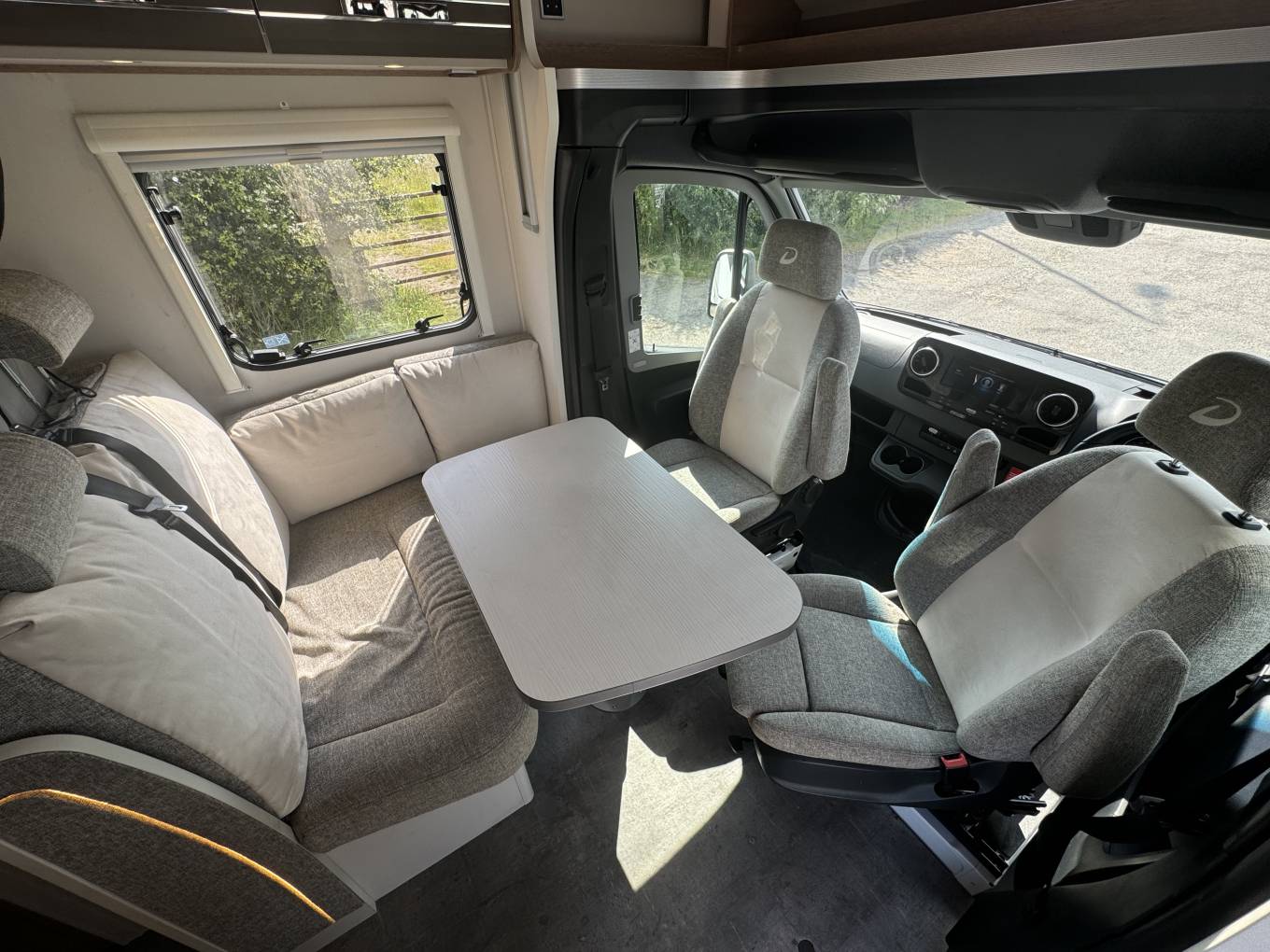 Both front captain seats swivel to provide extra seating around the dining table, enhancing the living area