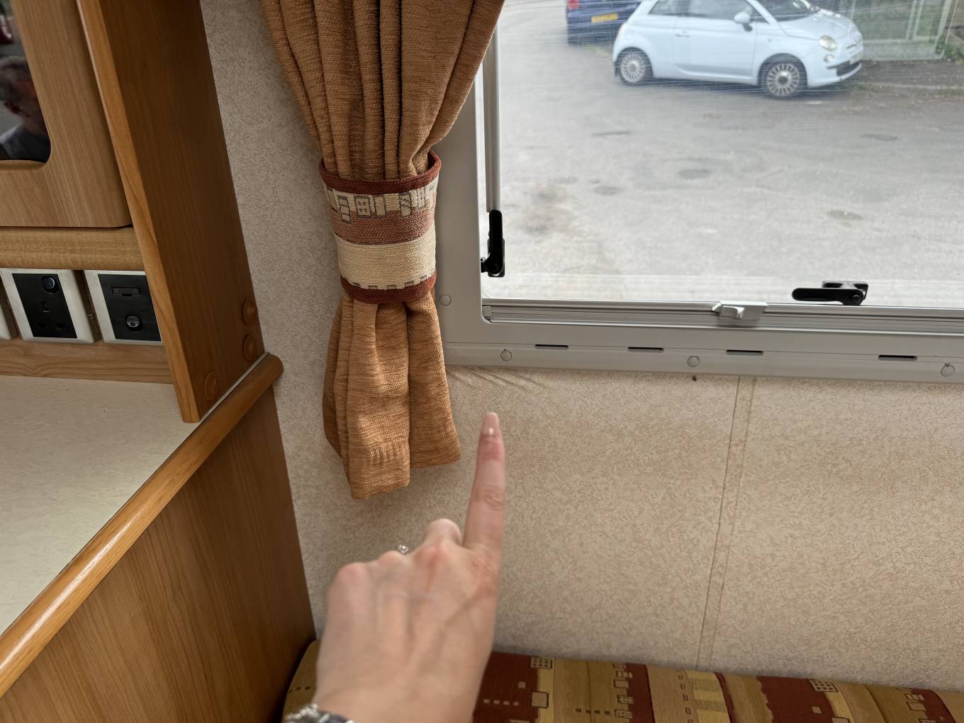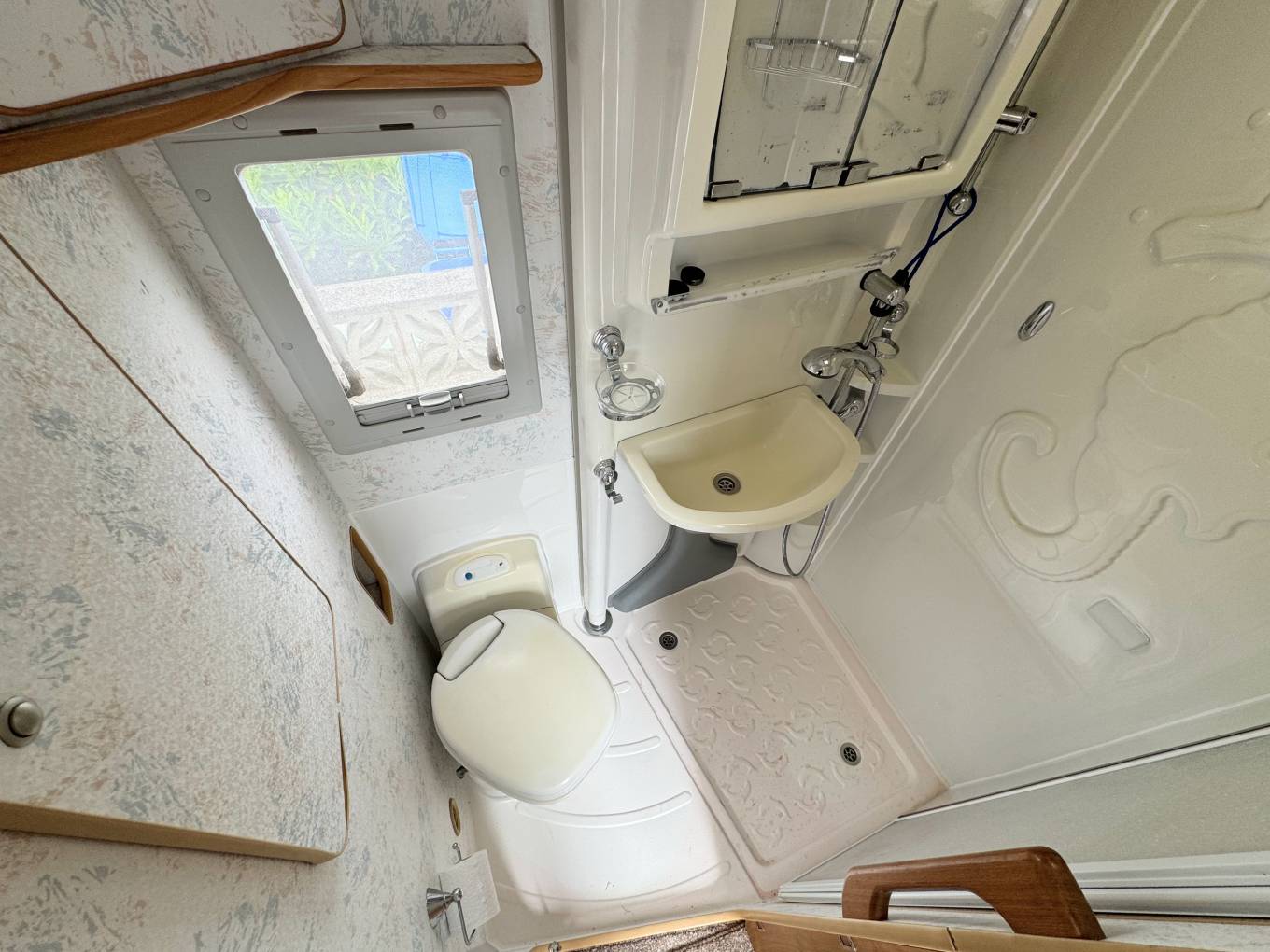 Adjacent from the kitchen sits the washroom this houses a toilet cassette, hand wash basin, mirrored cabinet and shower.
