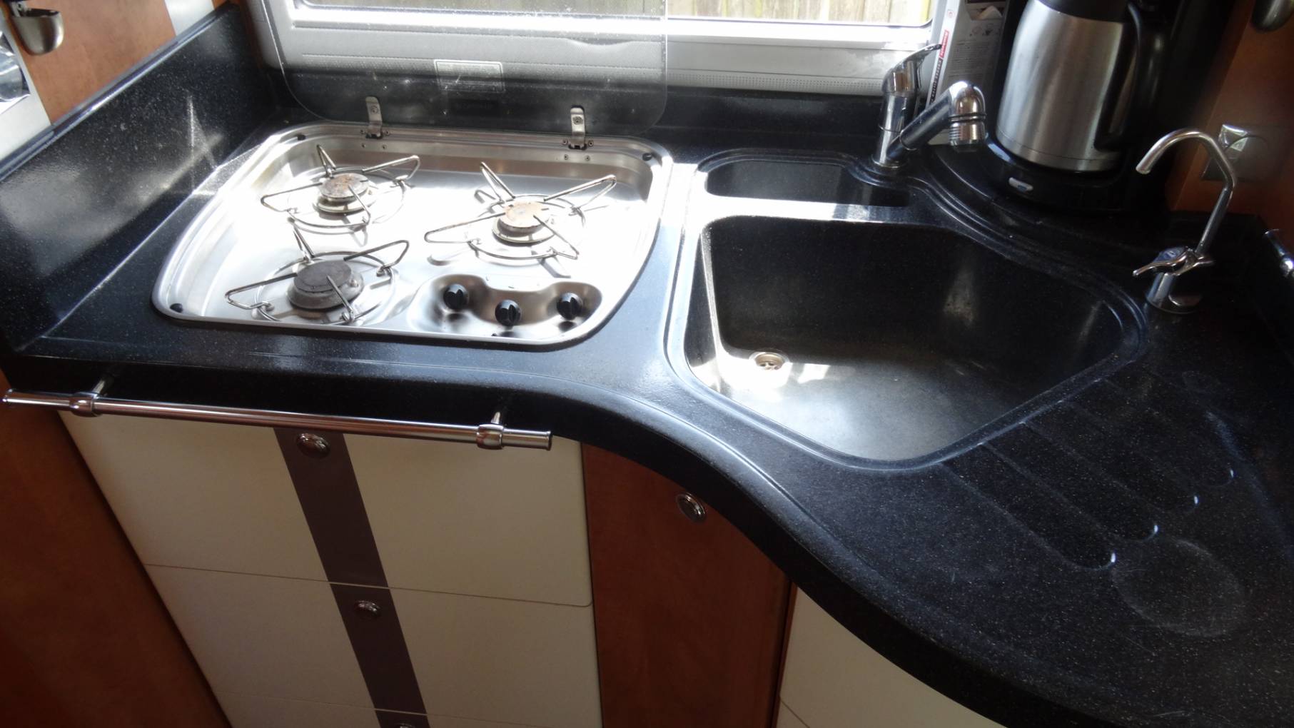 Forward of the shower compartment is a kitchen with 3-burner