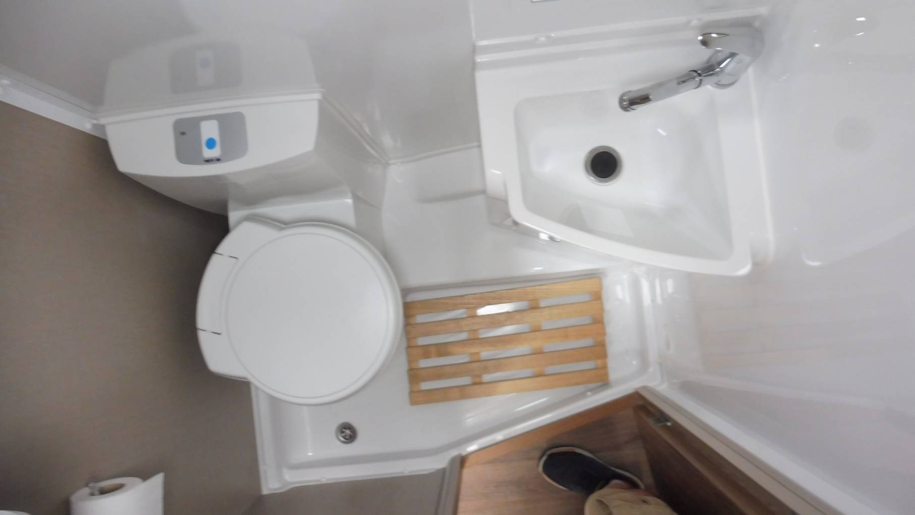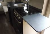 The mid-ships side kitchen has everything you need to rustle up lunchtime snacks or the full evening meal; 3-burner hob, combination oven, microwave and 3-way fridge. Opposite which sits the washroom with cassette toilet, vanity sink unit and shower over.