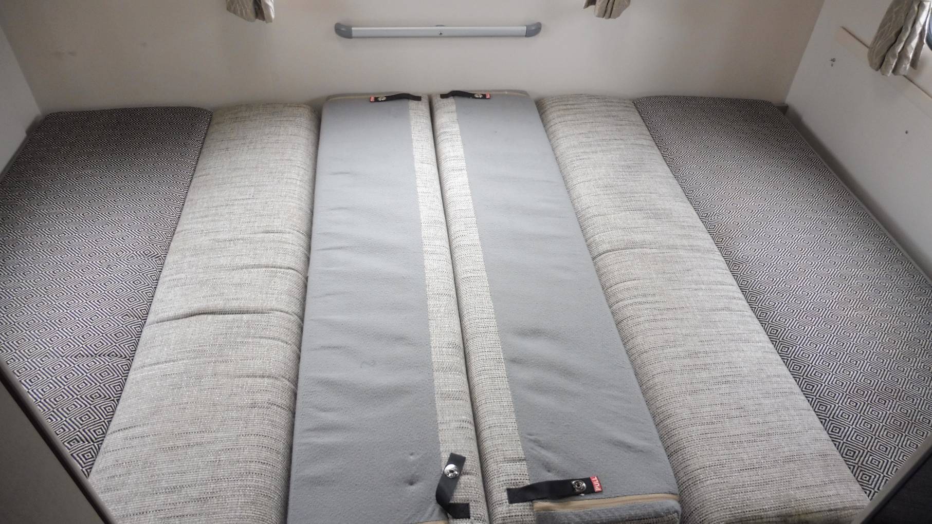 At the rear of the motorhome is the second seating area - a u-shaped lounge which converts into a double bed at night.
