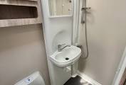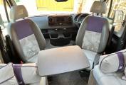 Once you enter the van you will notice the well equipped kitchen, comprising of a 4 burner hob, (3 gas plus 1 electric hotplate), full size oven with seperate grill, kitchen extractor, sink and drainer with hot and cold running water, microwave, fridge with freezer compartment and with additional pull out workspace above. Opposite the kitchen is the wash room, toilet and separate swing wall shower area. Also you have a good sized hanging wardrobe which holds both the free standing and occasional tables.