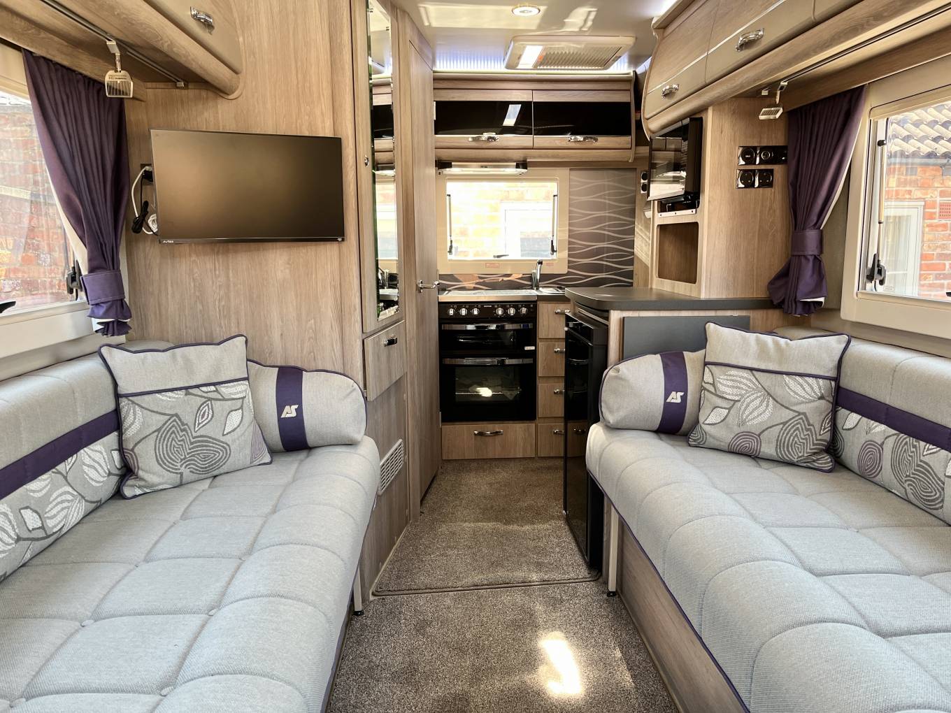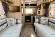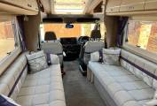 Once in the lounge you will see the twin benches in the spacious socialising area, both front seats can be swiveled into the lounge area to create a good entertainment space, above the lounge there is plenty of storage in the overhead lockers and also under the twin benches. Also in the lounge are you have an Avtex Tv, and Wi-fi connectivity along with the Truma air conditioning unit. The habitation area is also complete with window blinds and fly screens and a flyscreen on the habitation door.