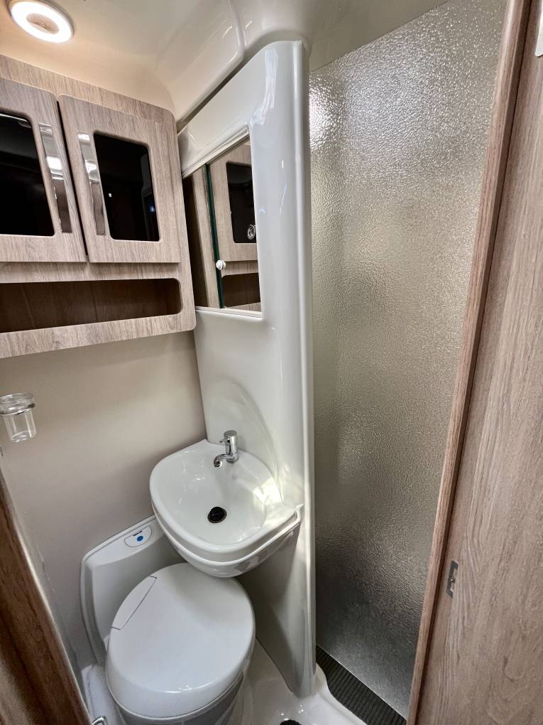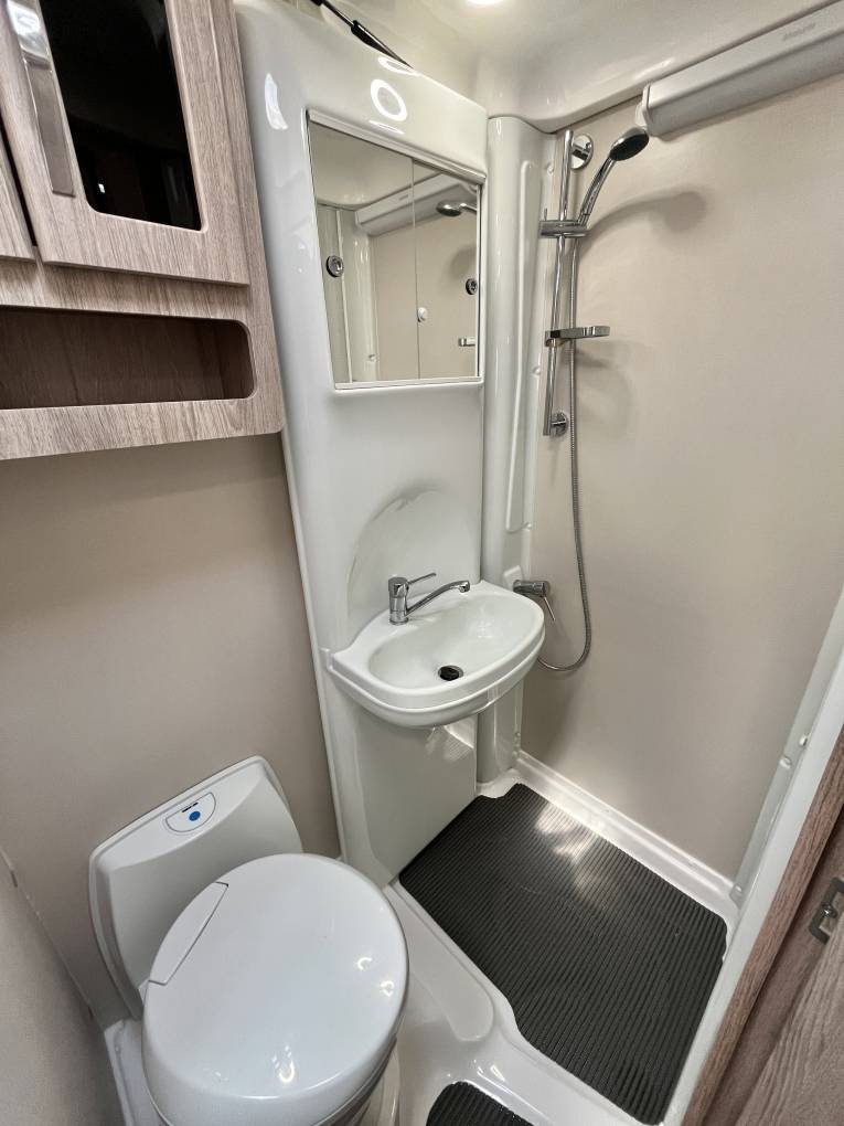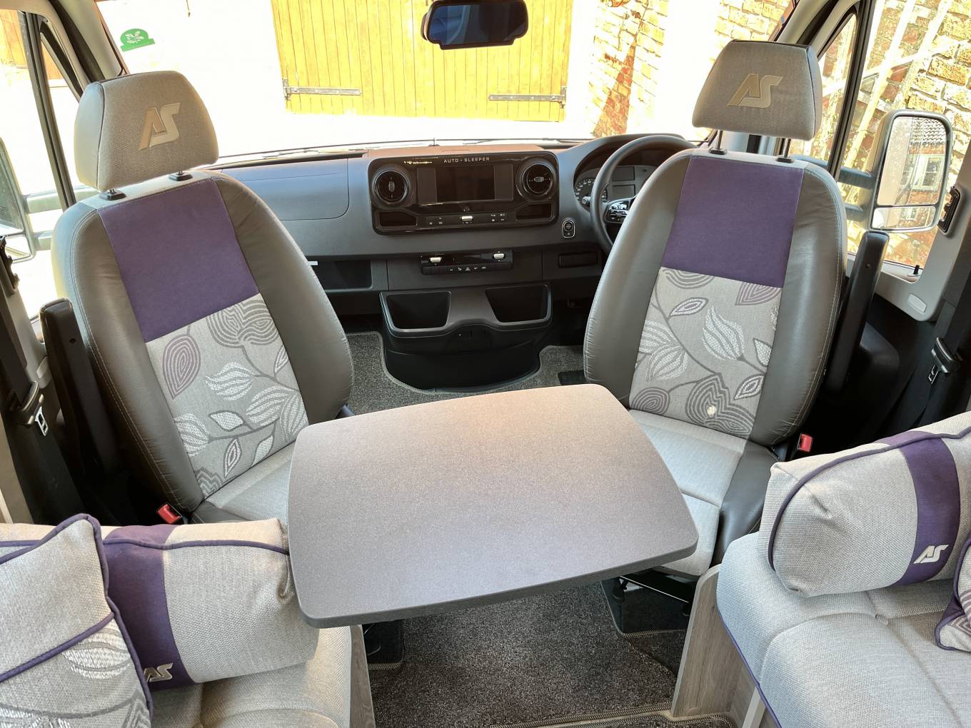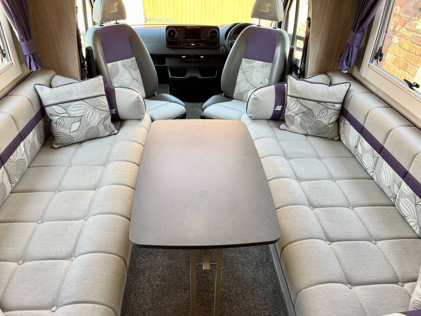 This van is based on the popular Mercedes Sprinter chassis with a fully automatic 7 speed gearbox, air conditioning, cruise control, MBUX media system and rear reversing camera. It is a 2 berth / 2 belt motorhome with an end kitchen layout and a spacious lounge area which can also convert to two good sized single or a large double bed. It Has the Santini woodwork with the ever popular Casa Mila Berry fabrics.