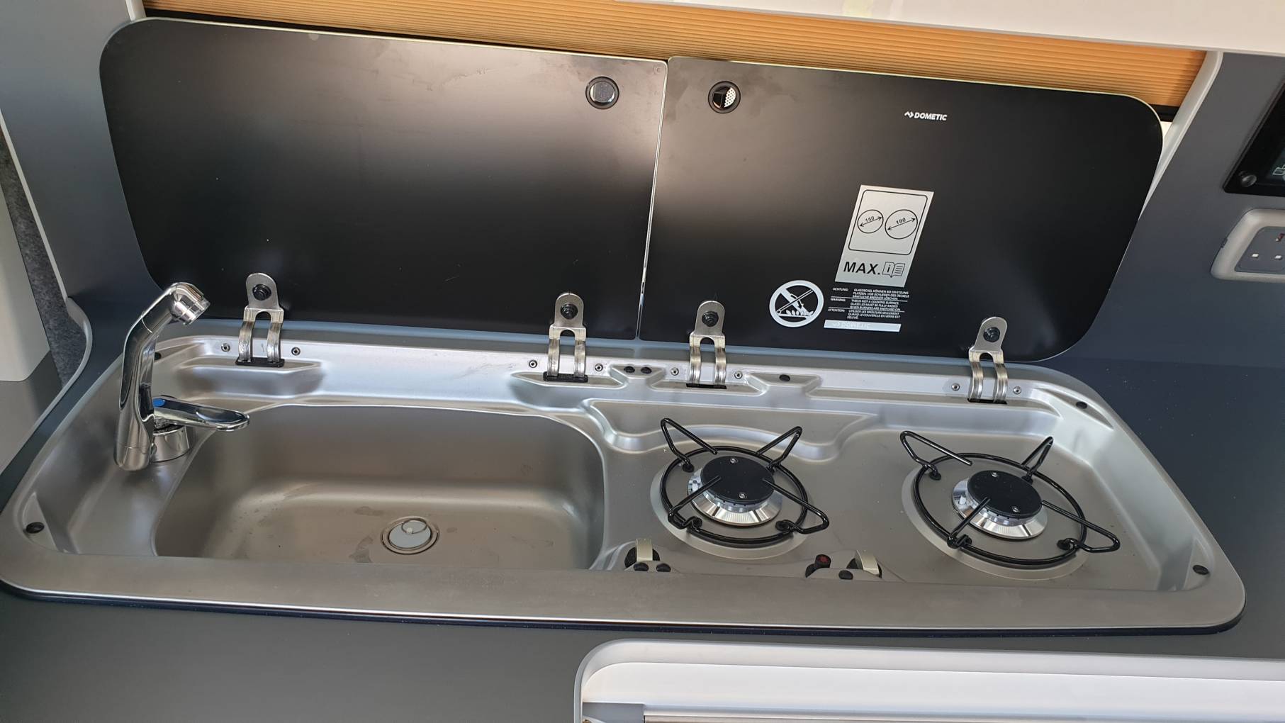gas hob, sink and mixer tap with matching cover, fridge, lockers and drawers
