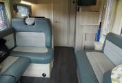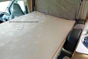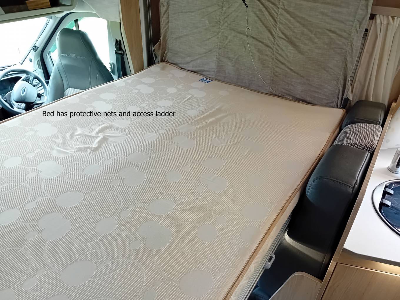 The forward dinette can seat up to six for a social and there is a free standing table for use as required. Storage is good with the passenger side underseat storage also accessible from outside. Above the dinette, a double bed lowers into position, with nets and an access ladder, while the seating can be converted into an occasional bed. The cab is quickly screened off using the integrated night blinds.