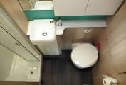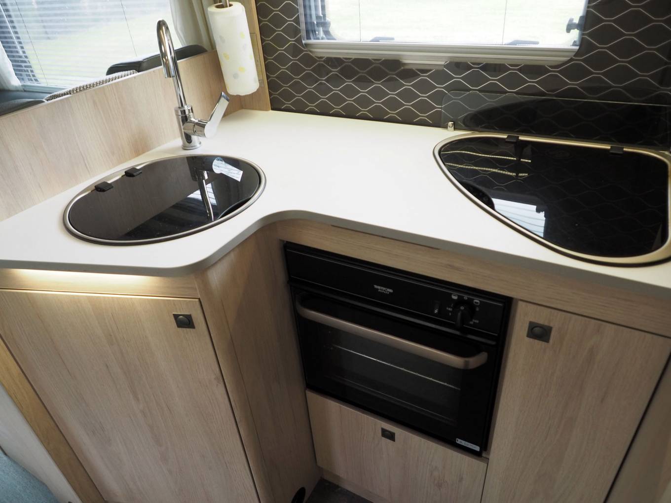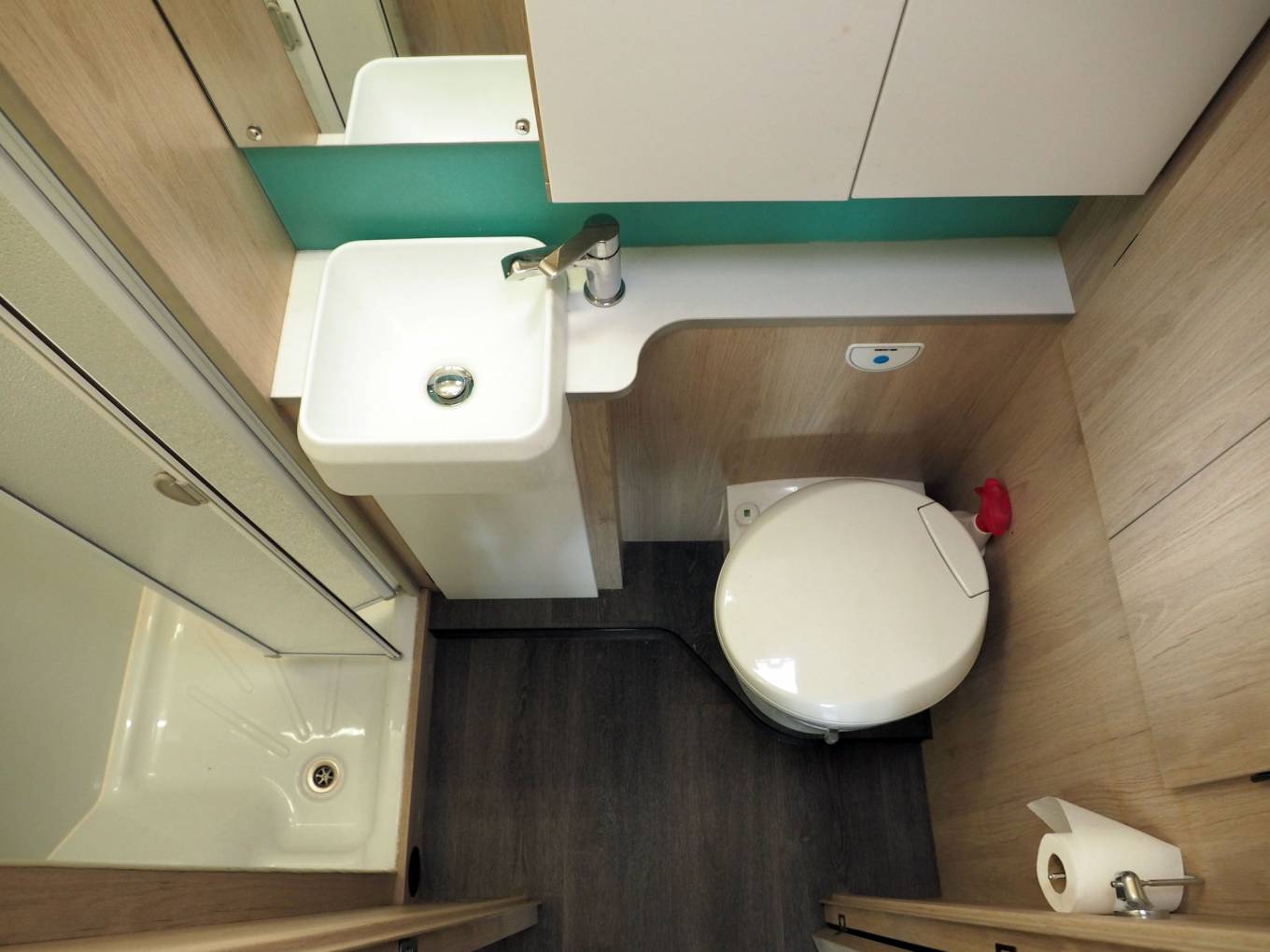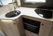 Surprisingly for such a compact motorhome, there is a full fridge freezer, 3 burner gas hob, gas oven and grill, an Omnivent roof extractor and decent storage in the kitchen. There is also a good sized wardrobe in the washroom, along with toilet, vanity sink and solid lined shower cubicle.