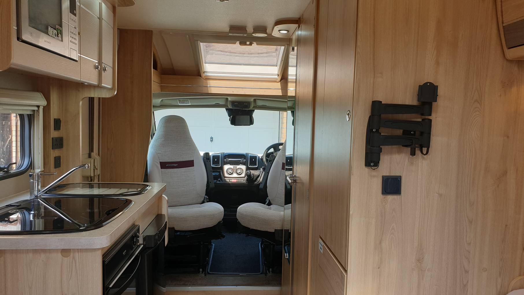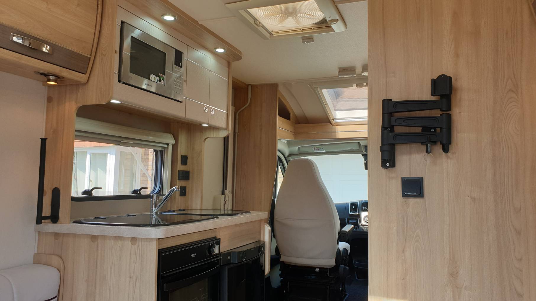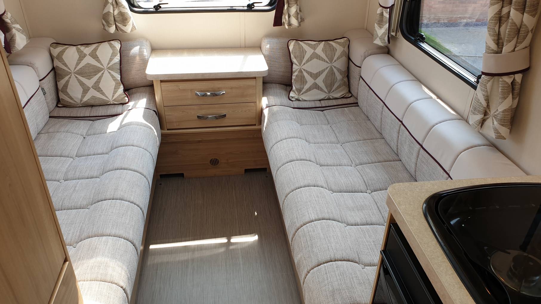 The rear lounge converts into a double bed at nighttime. Outside there is a wind out awning, solar panel, a bike rack, 2 x gas bottles, aerial, external shower point, external silver thermal blind for the front and 2 new tyres. MOT to 20/6/2025. The front right hand concertina blind is damaged but still works.