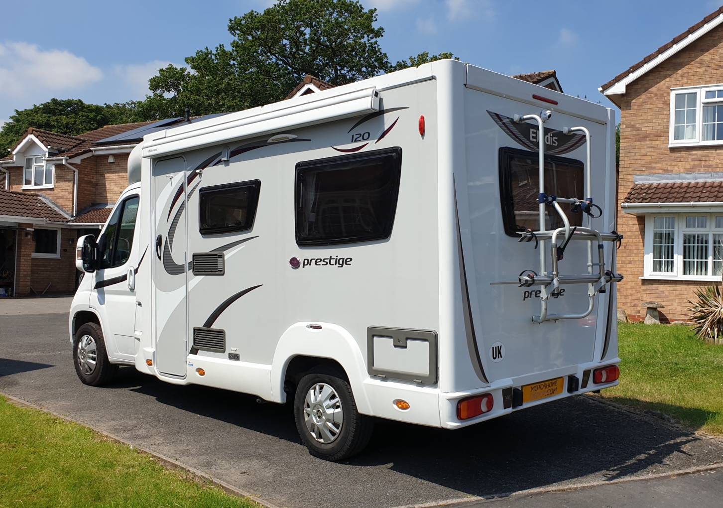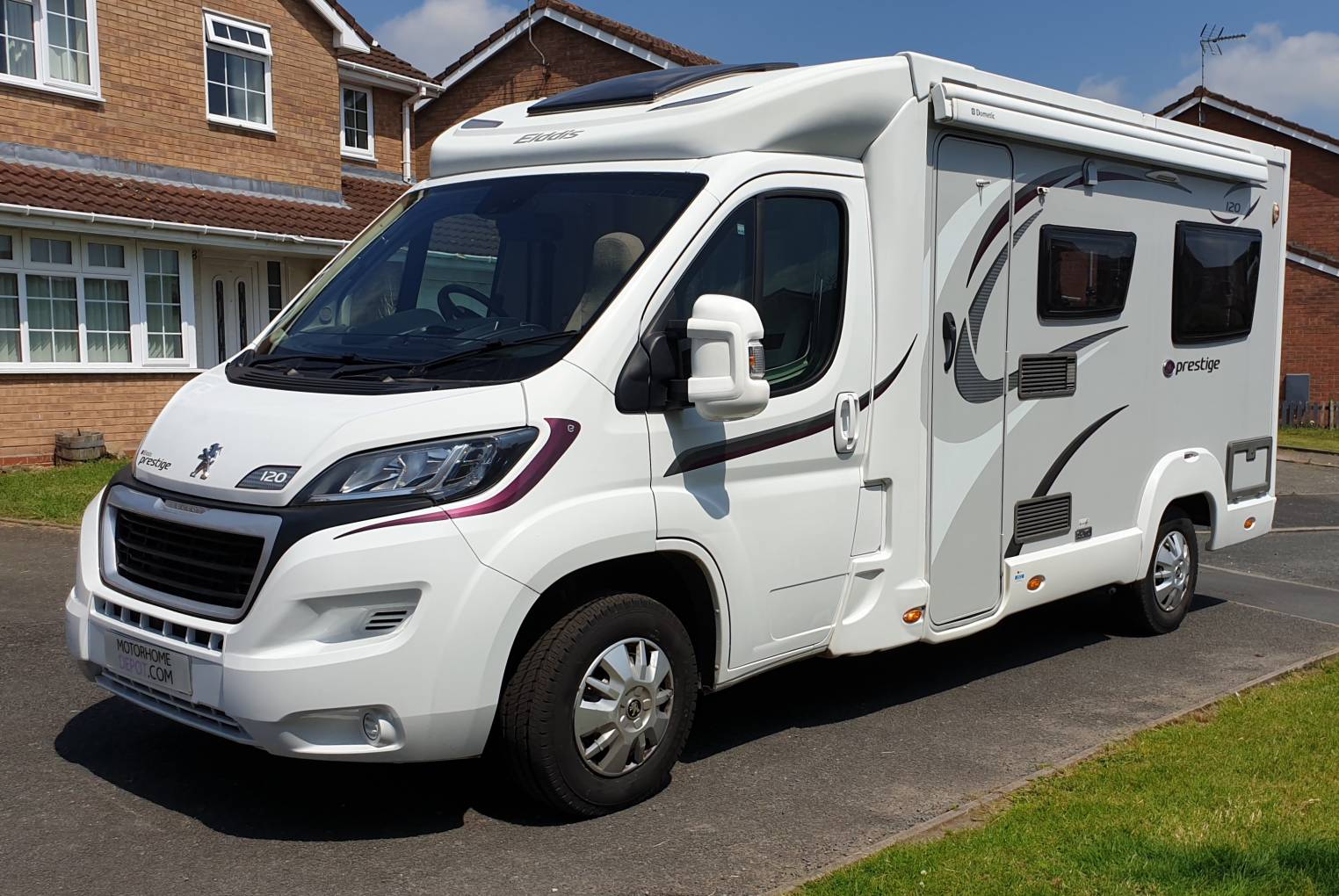Motorhome Depot Ellesmere and Shrewsbury are pleased to offer for sale this 2017 Elddis Prestige 120, a compact 2 berth, 2 belted motorhome less than 6 metres long. The 2 owner motorhome is based on a Peugeot Boxer chassis, with a 2 litre diesel engine and 5 speed manual transmission and has covered 26,375 miles. Upfront there is cruise control, alarm, reversing camera, cab aircon, radio, arm rests, cab blinds and two swivelling captains chairs.