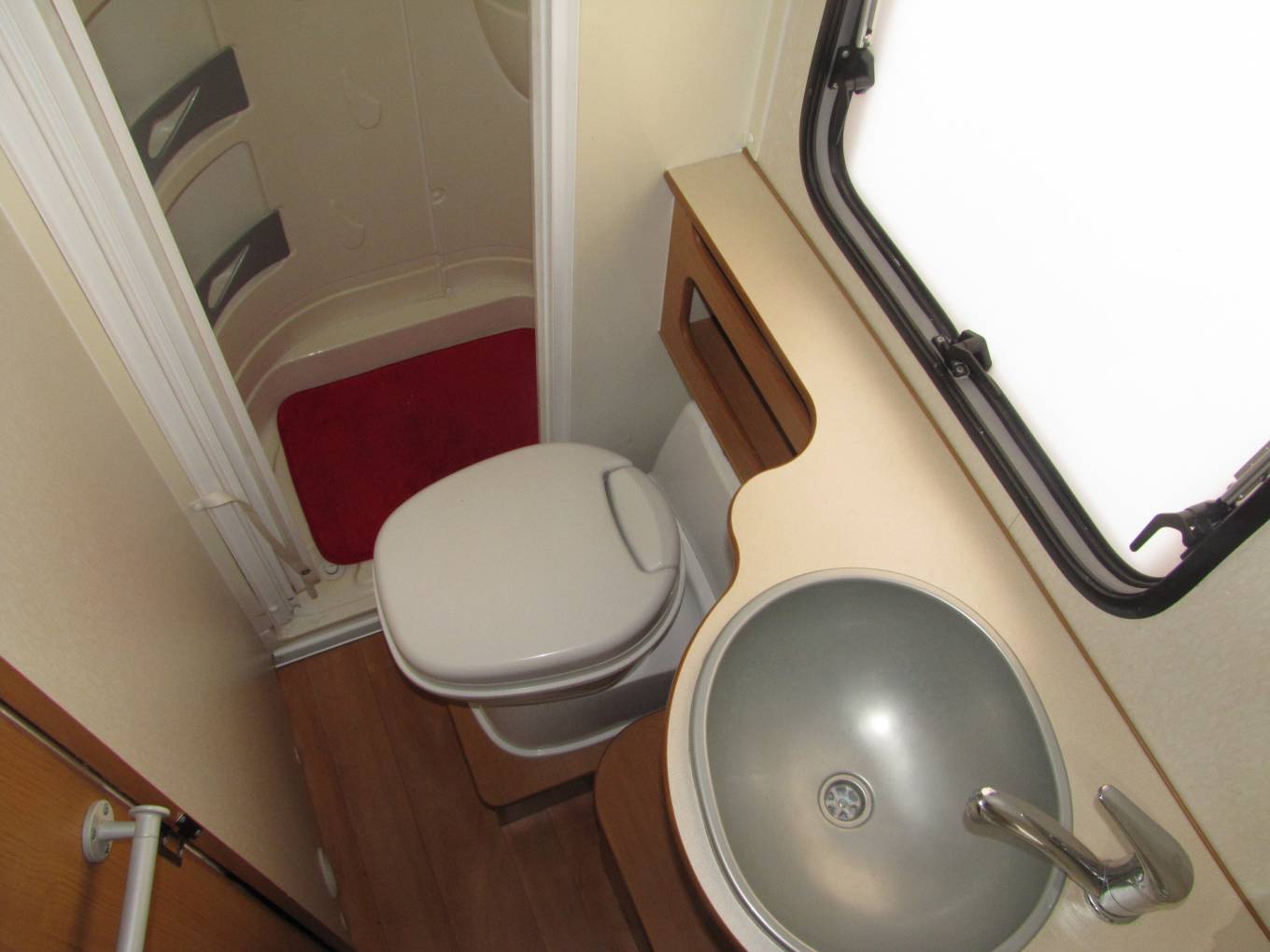 On to the rear of the vehicle you have the popular fixed French double bed with ottoman storage. also, to the rear of the vehicle you have the washroom with full separate shower, toilet, sink and storage facilities.