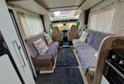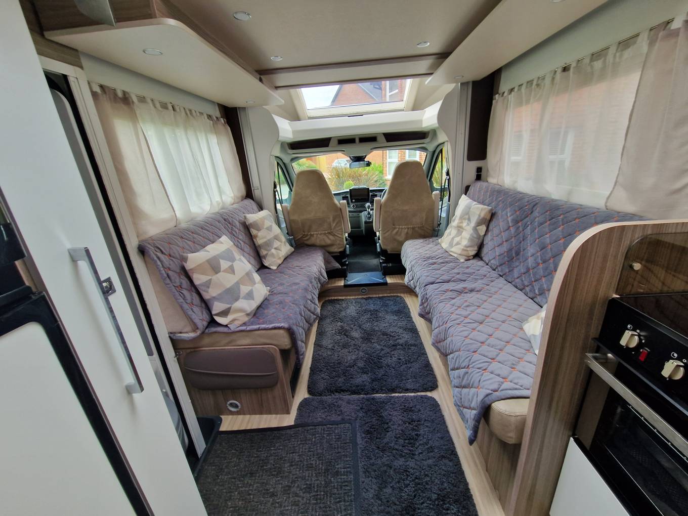 Entering the motorhome from the passenger side we have the main living area which is a fantastic space for relaxing and is perfect for entertaining with two large side sofas, two swivelling Captains seats and a large folding dining table giving a great space for meals or games.