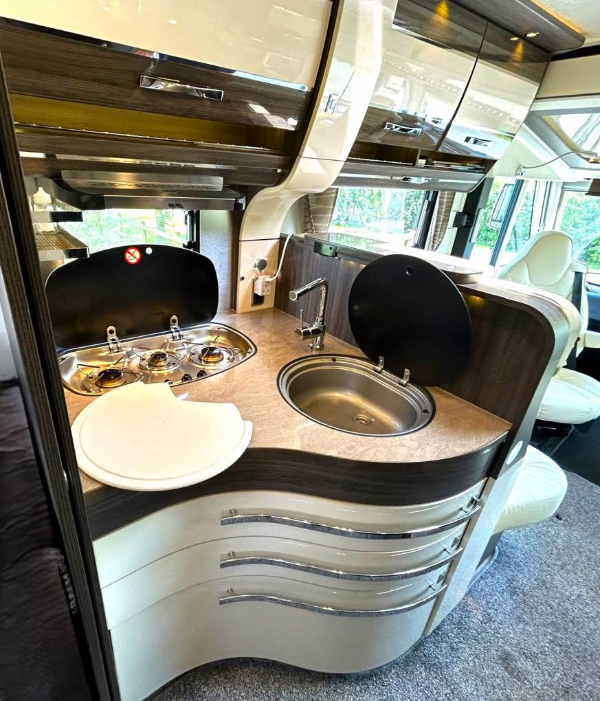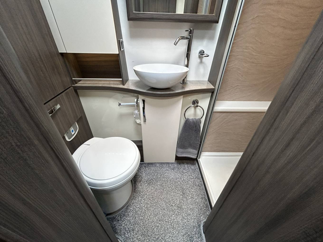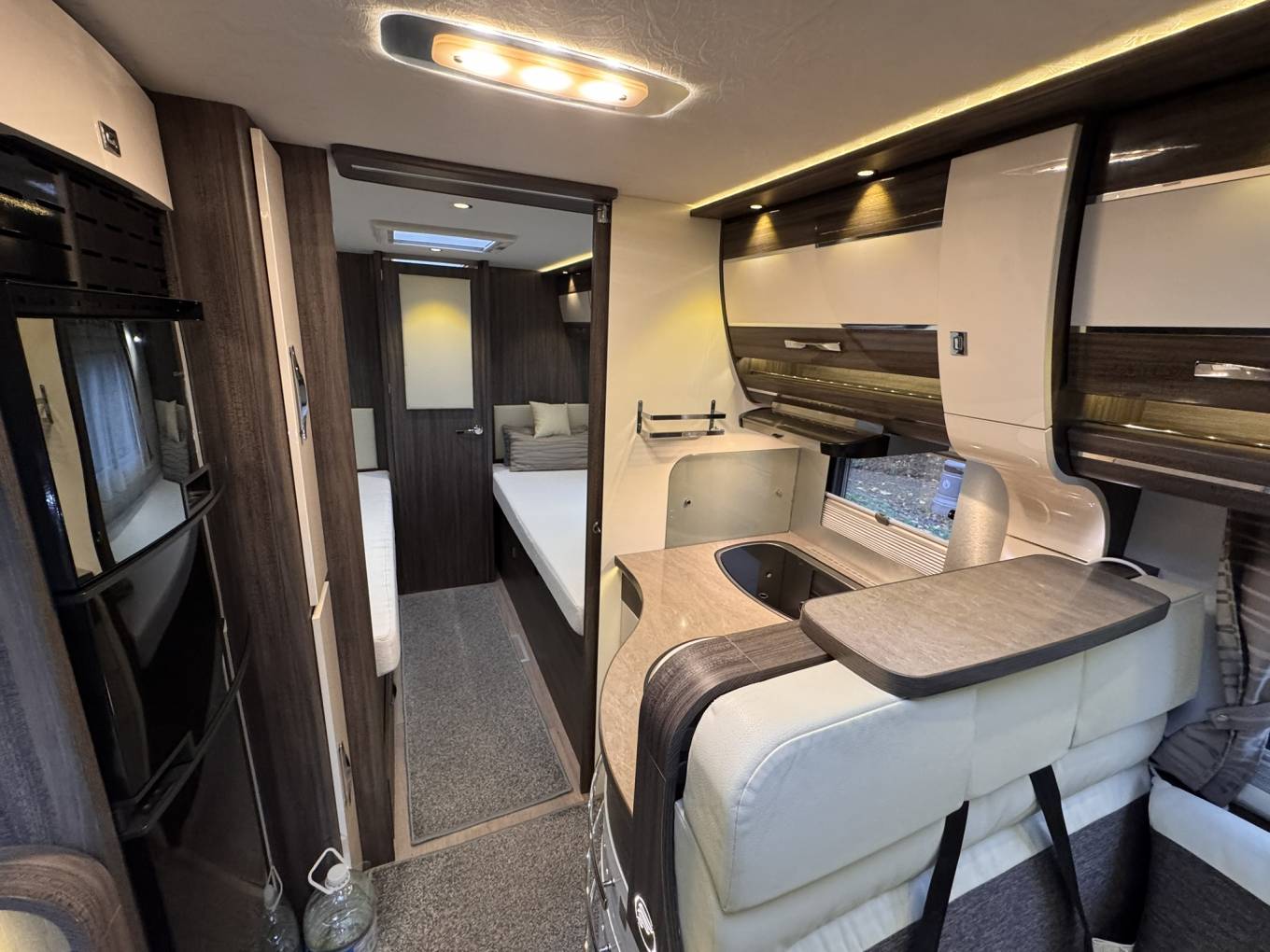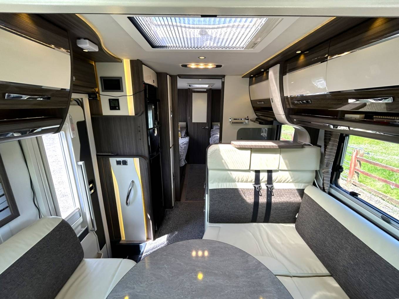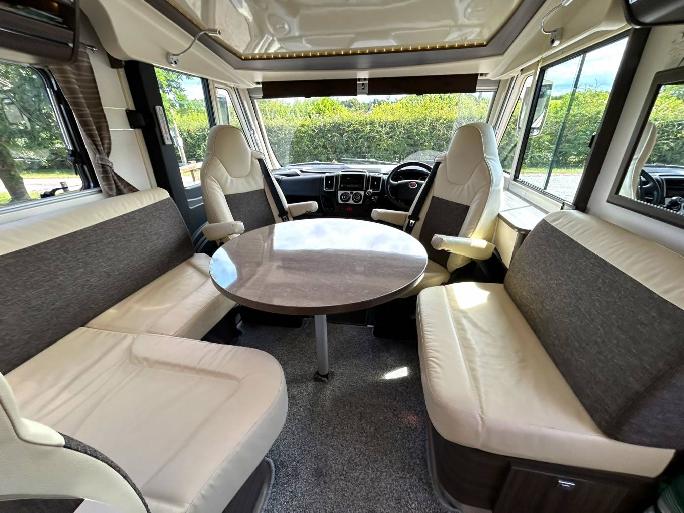 Radio, CD, cab air con, cruise control, reversing camera, front cab blinds, 2 swivel Captain seats, alarm, tracker, 3-ring gas hob, combined oven & grill, tall fridge with separate freezer, sink with hot and cold mixer tap, kitchen extractor, solar panel, TV aerial, 2 TV’s, carpets, Truma hot water and heating system and additional diesel heater, AGM leisure battery, wind out awning, gas bottle, external gas BBQ point, spare wheel and 230v hook-up cable.