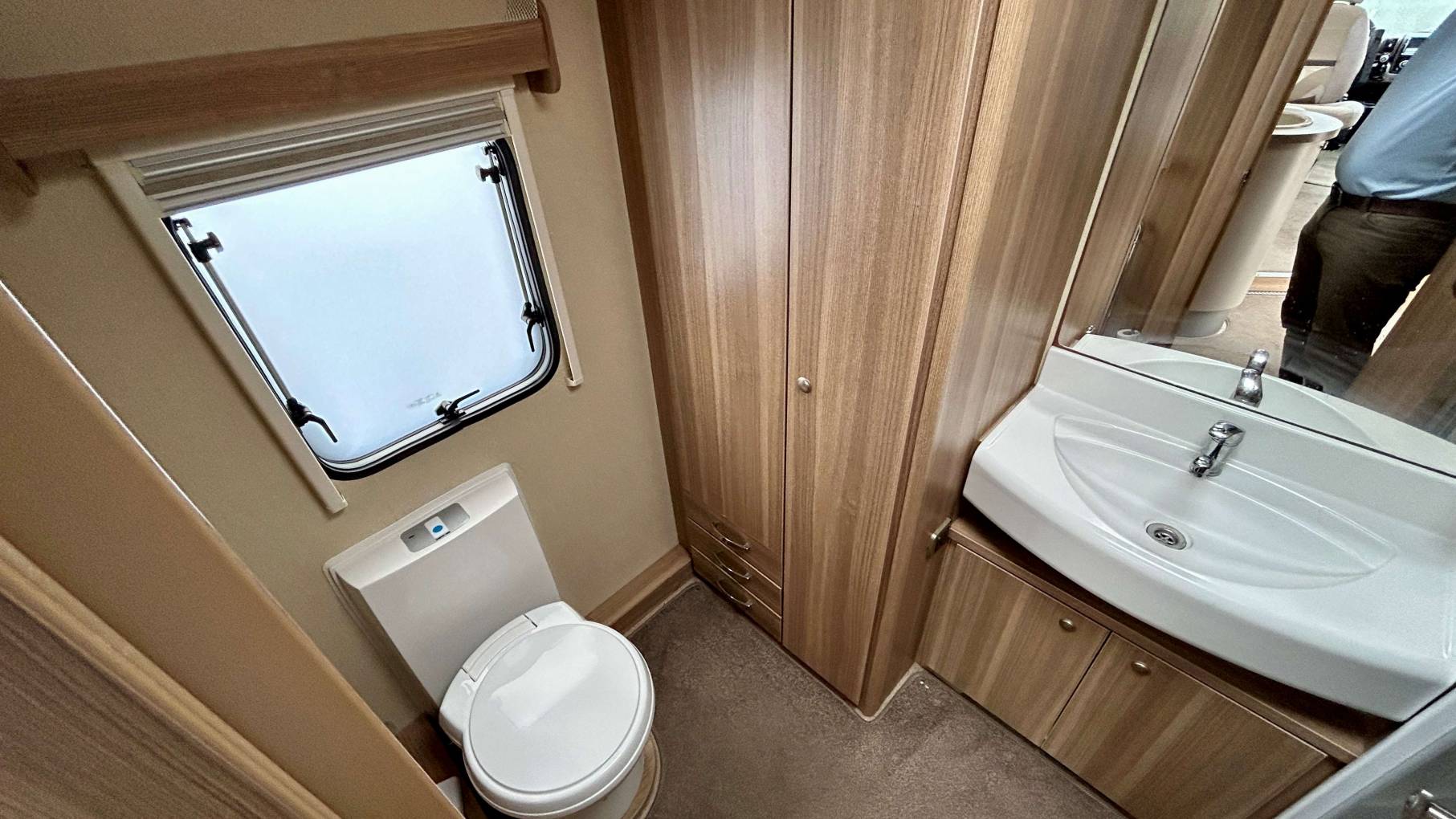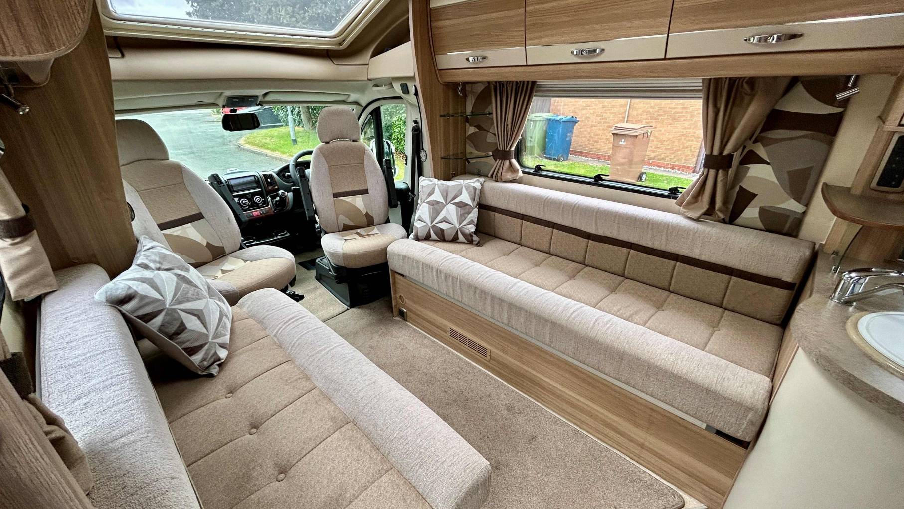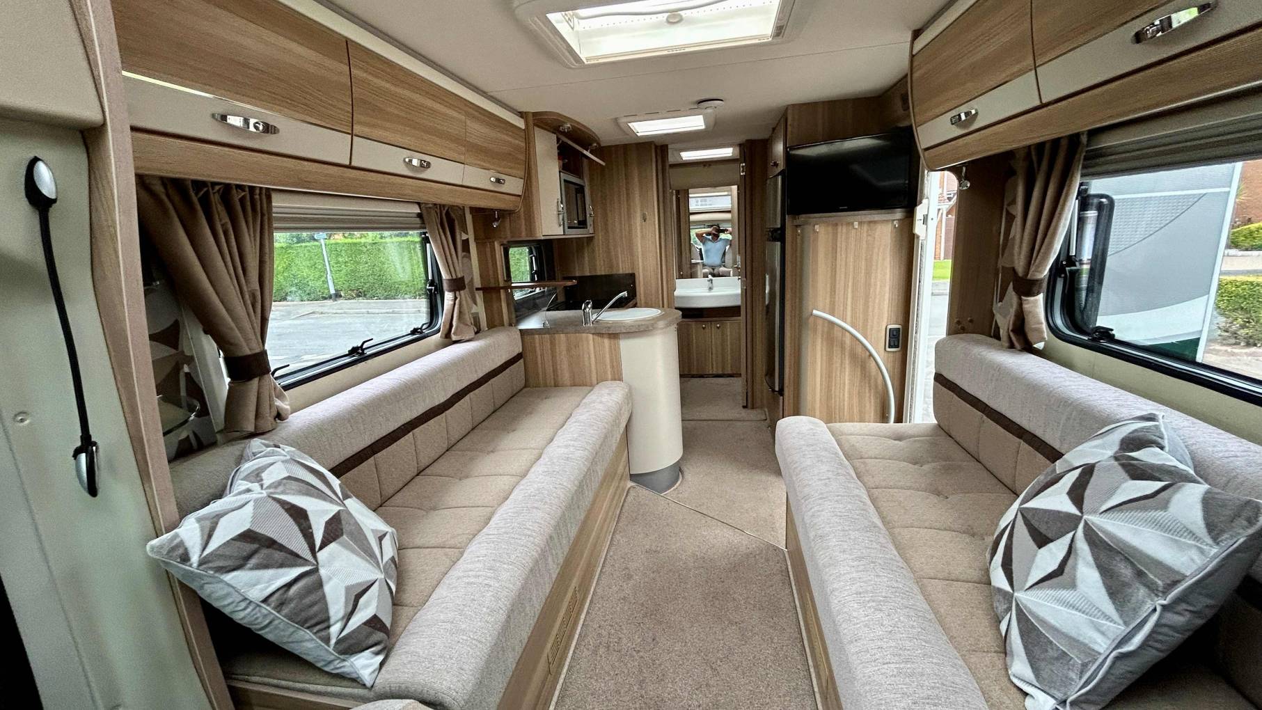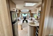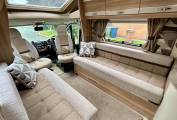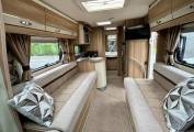 The layout consists of a front lounge with 2 side facing settees which are nicely complemented by 2 swivelling captains seats creating a large and lovely socialising space. To the centre of the vehicle is the high specification kitchen, which includes a 3 gas and 1 electric ring hob, separate oven and grill, microwave and a large Thetford fridge freezer. The fully equipped and spacious rear bathroom has a separate shower cubicle, toilet and hand basin, vanity unit, large mirror, Alde radiator and the arrangement of storage gives a flawless finish with two wardrobes, drawers and cupboards built in. The lounge seating quickly converts into a large transverse double bed. Four skylights flood the motorhome with light as they flow right through to the end washroom.