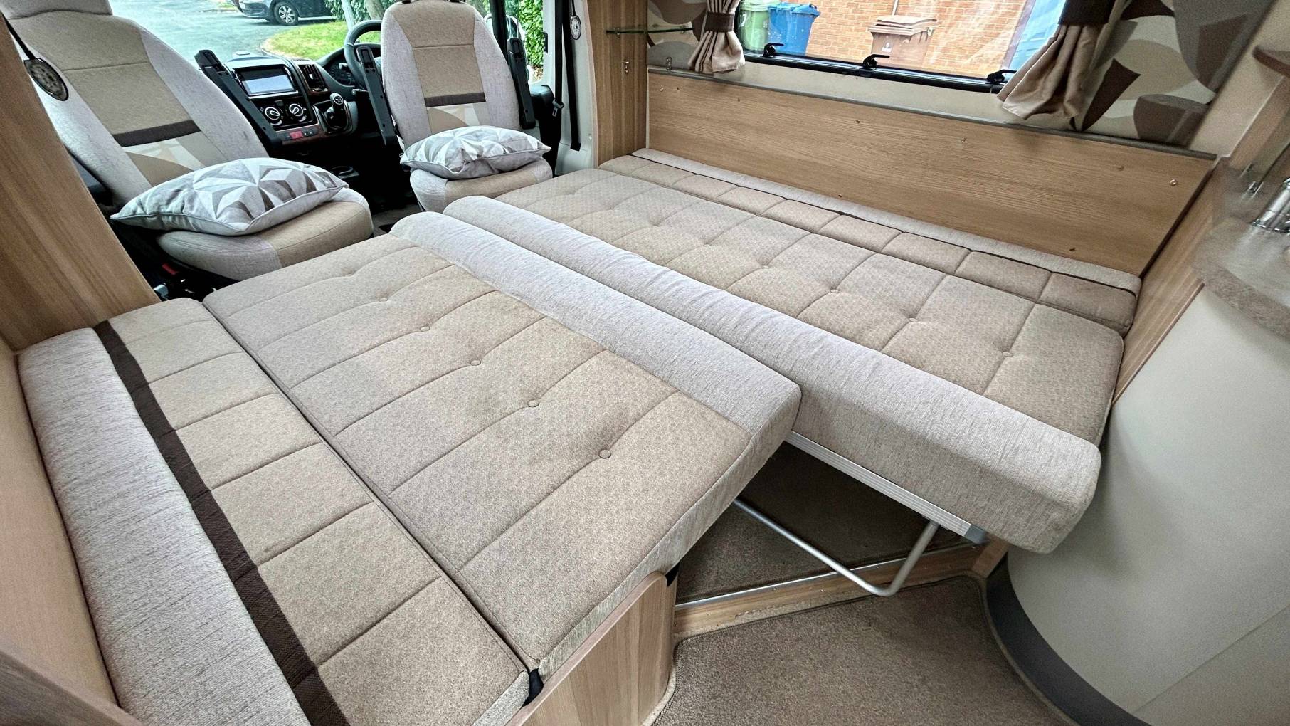 This motorhome also comes with a Tow Bar, Spare wheel, Wind out Awning, a TV in the lounge, gas bottle, mirror guards, external thermal screen cover and removeable carpets.