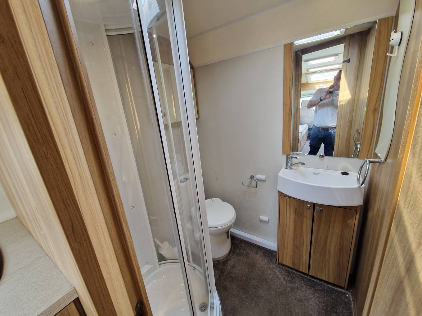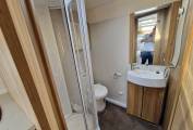The 175 is a very comfortable van to sleep in with the side sofas making up an extremely large double bed or can equally be used as two comfortable singles if you prefer. The real star of this motorhome is the large washroom at the rear which features a Thetford flush cassette toilet, vanity sink and large separate shower. There is also lots of space in the washroom which is definitely not always the case. Heating and hot water is provided by the Whale heating system on gas and mains hookup.